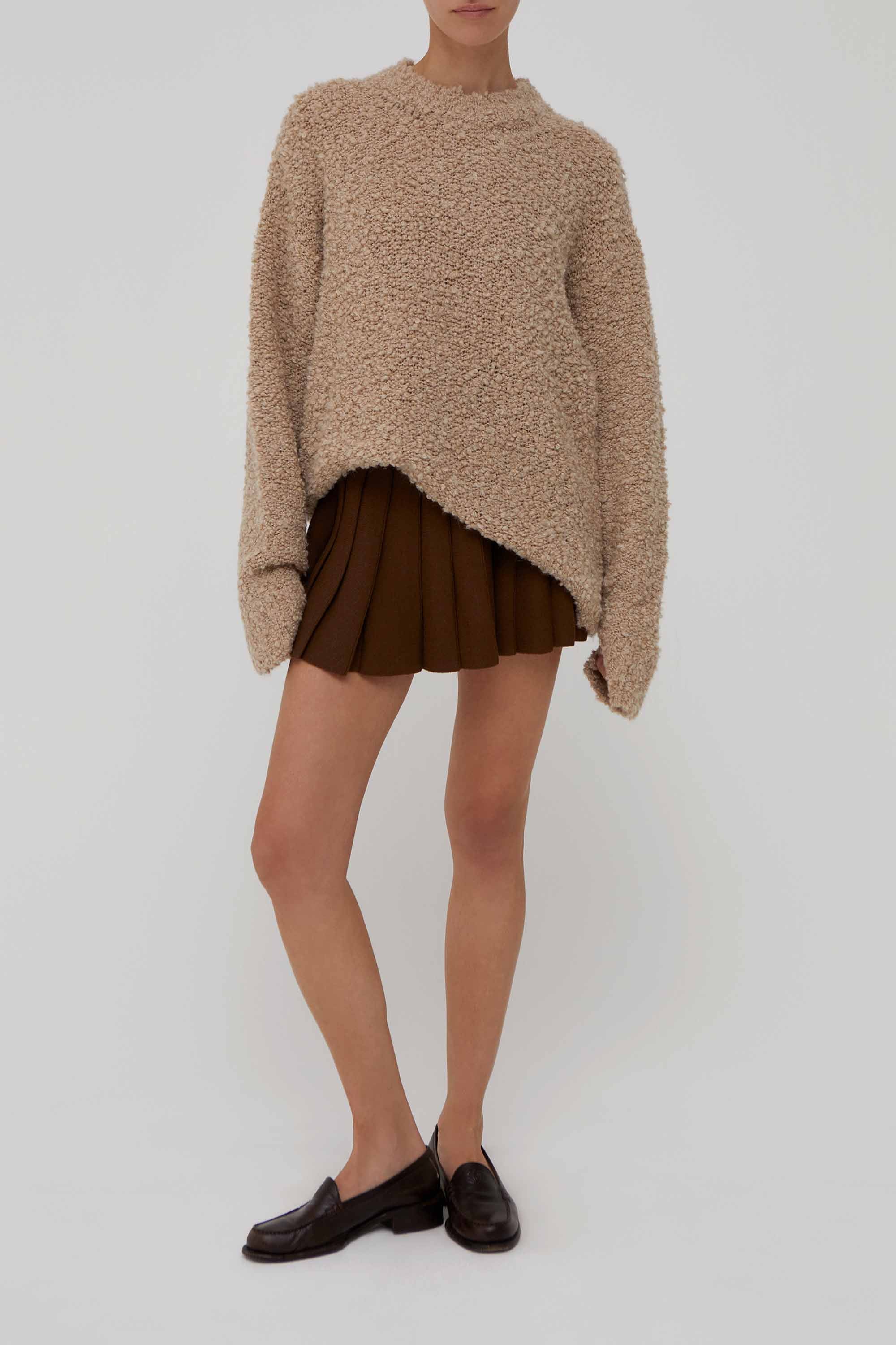 Oversized crewneck sweater in camel and baby alpaca bouclé, defined by its plush, textured hand and relaxed drape, finished with an asymmetric hem for a subtle play on proportion.