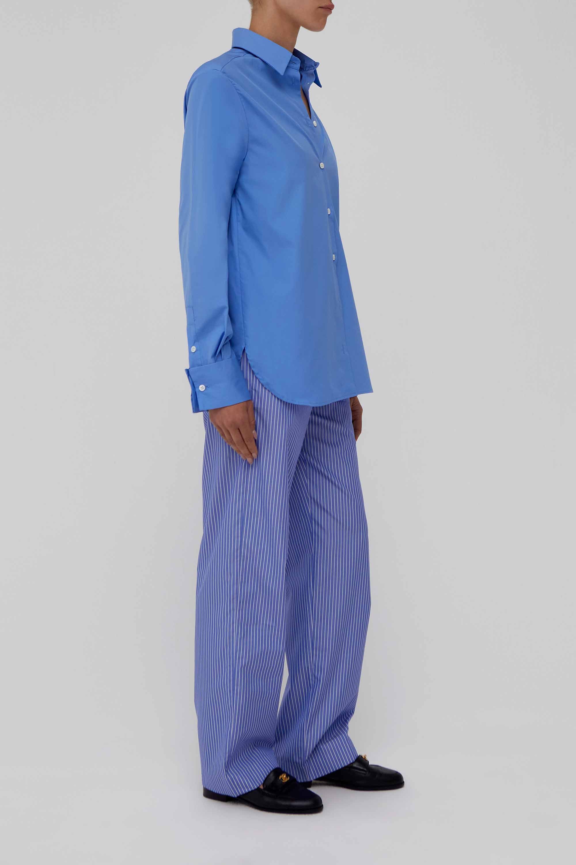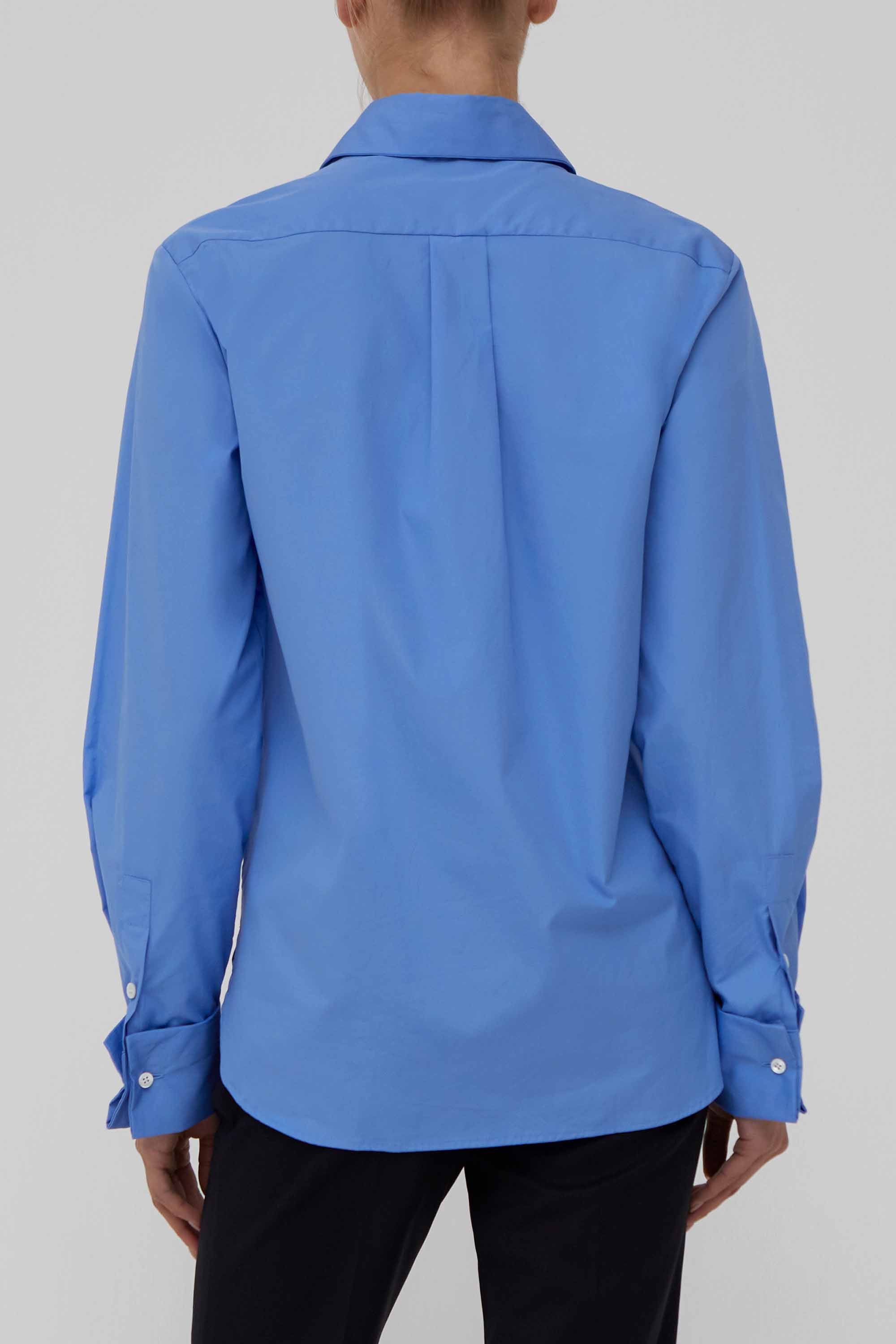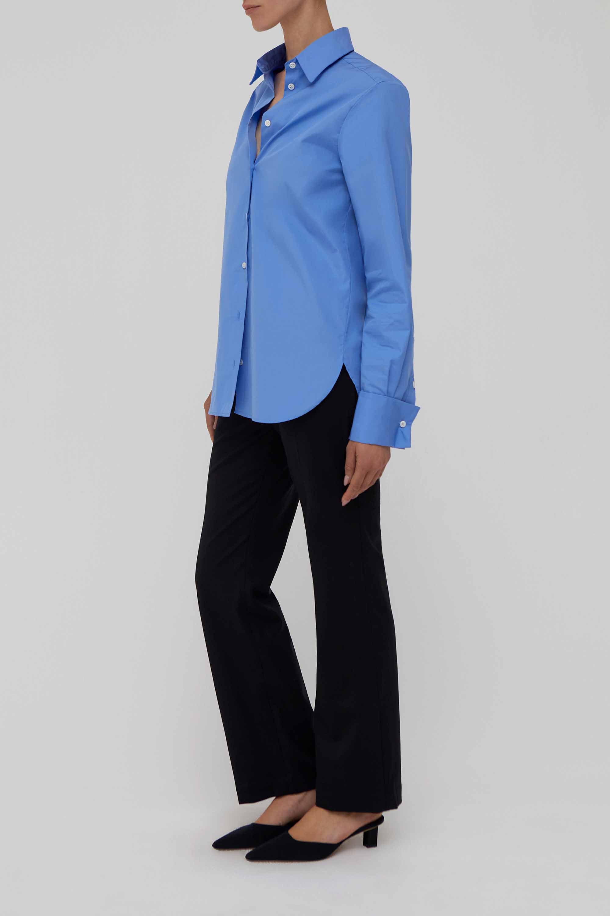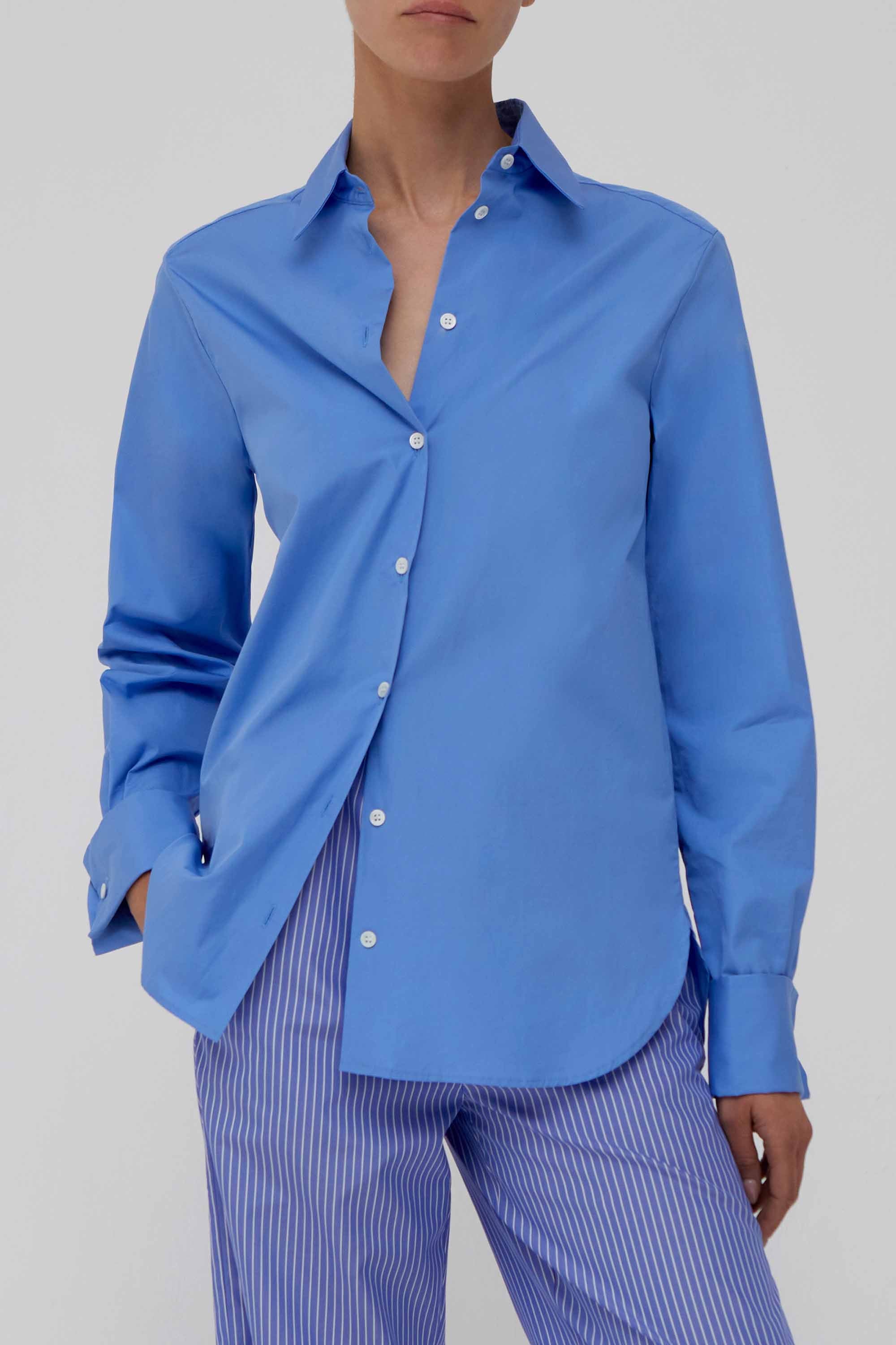 Crisp cotton poplin button-down shirt in blue, tailored with a sharp collar, elongated cuffs, and a fluid drape for structure and ease.