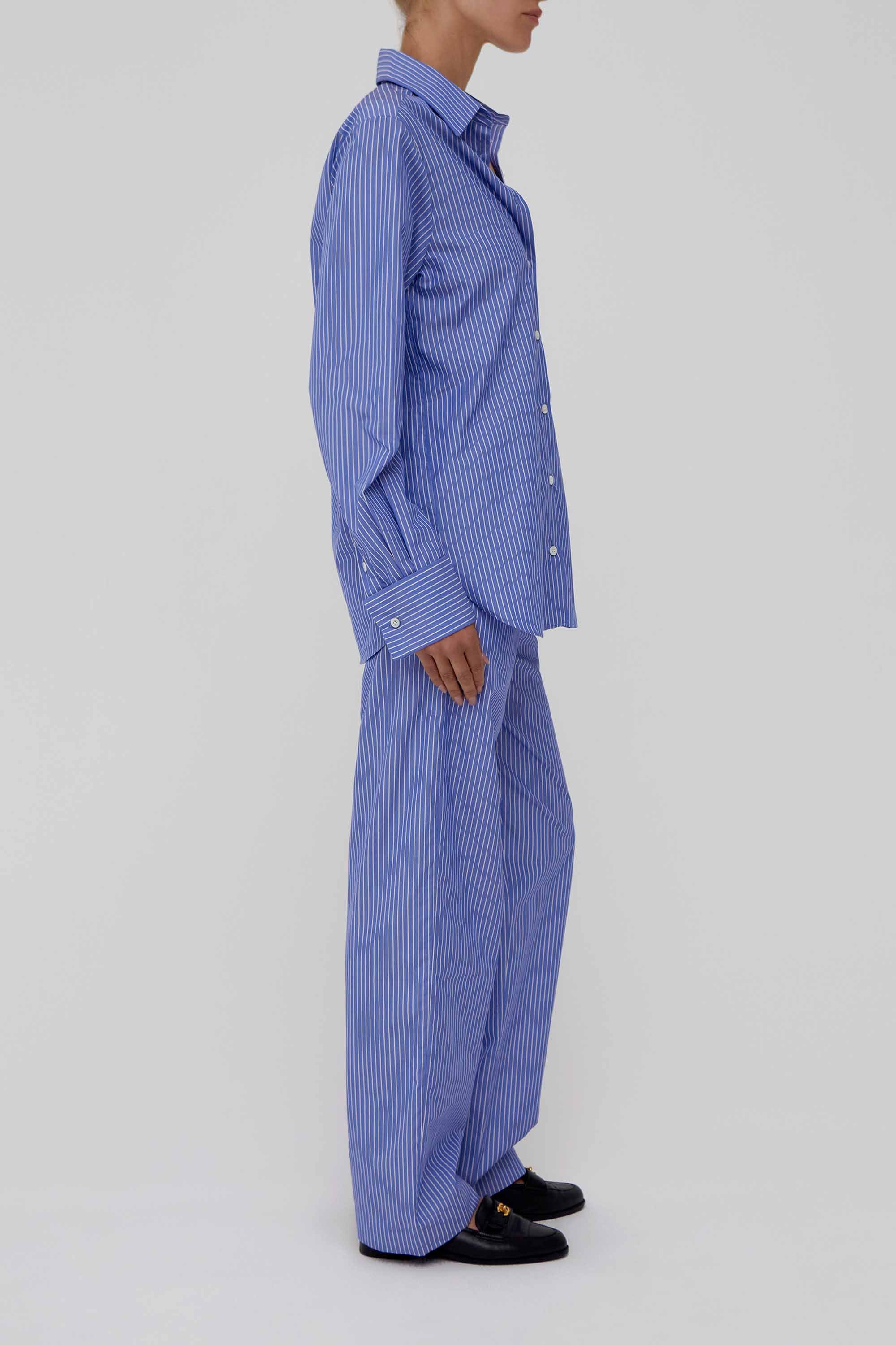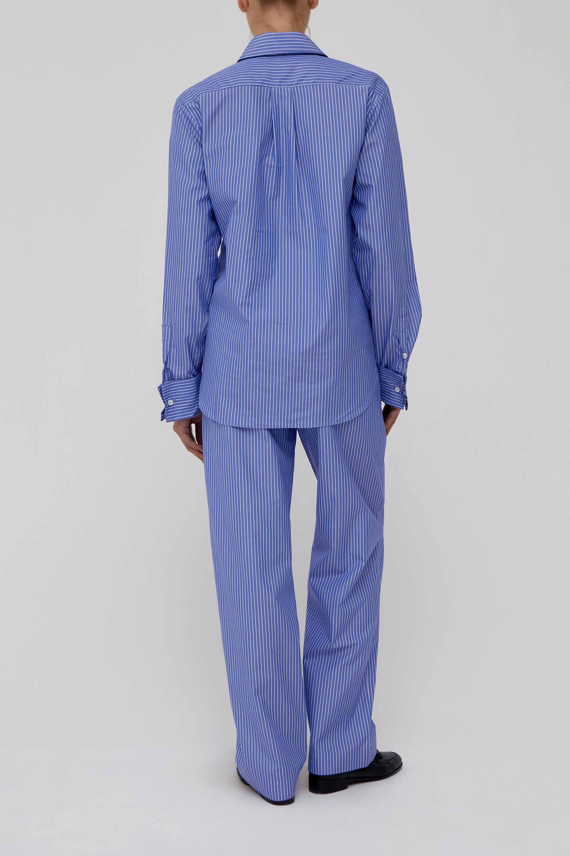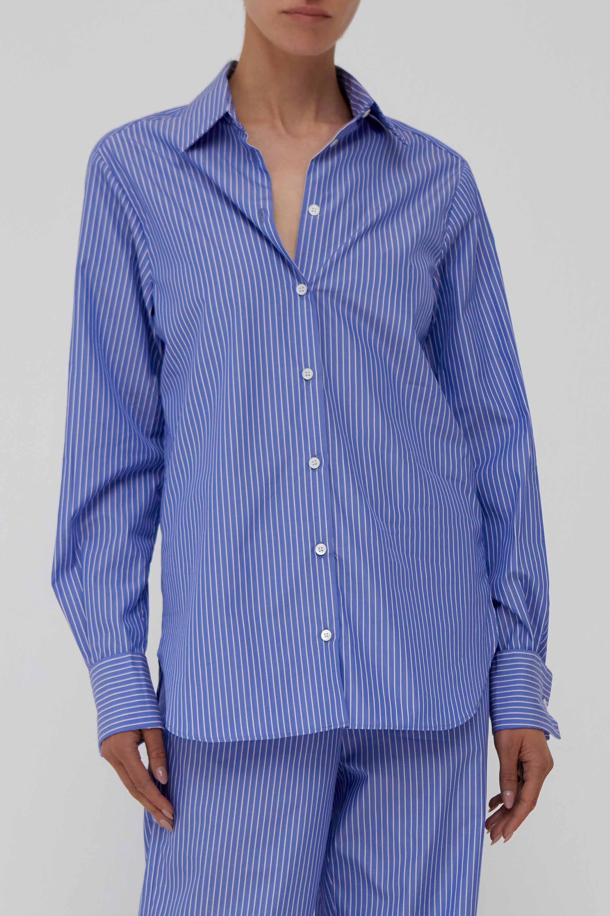 Crisp cotton poplin button-down shirt in blue and white pinstripes, tailored with a sharp collar, elongated cuffs, and a fluid drape for structure and ease.