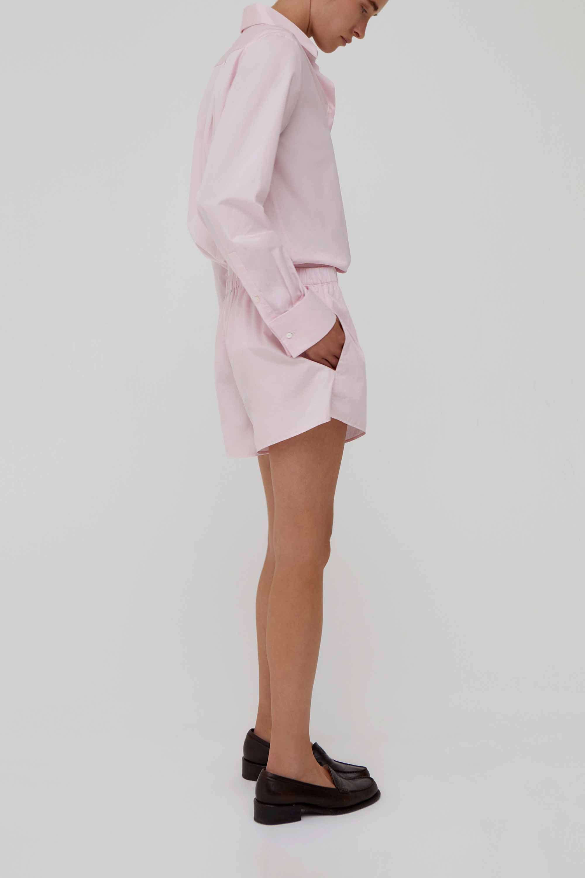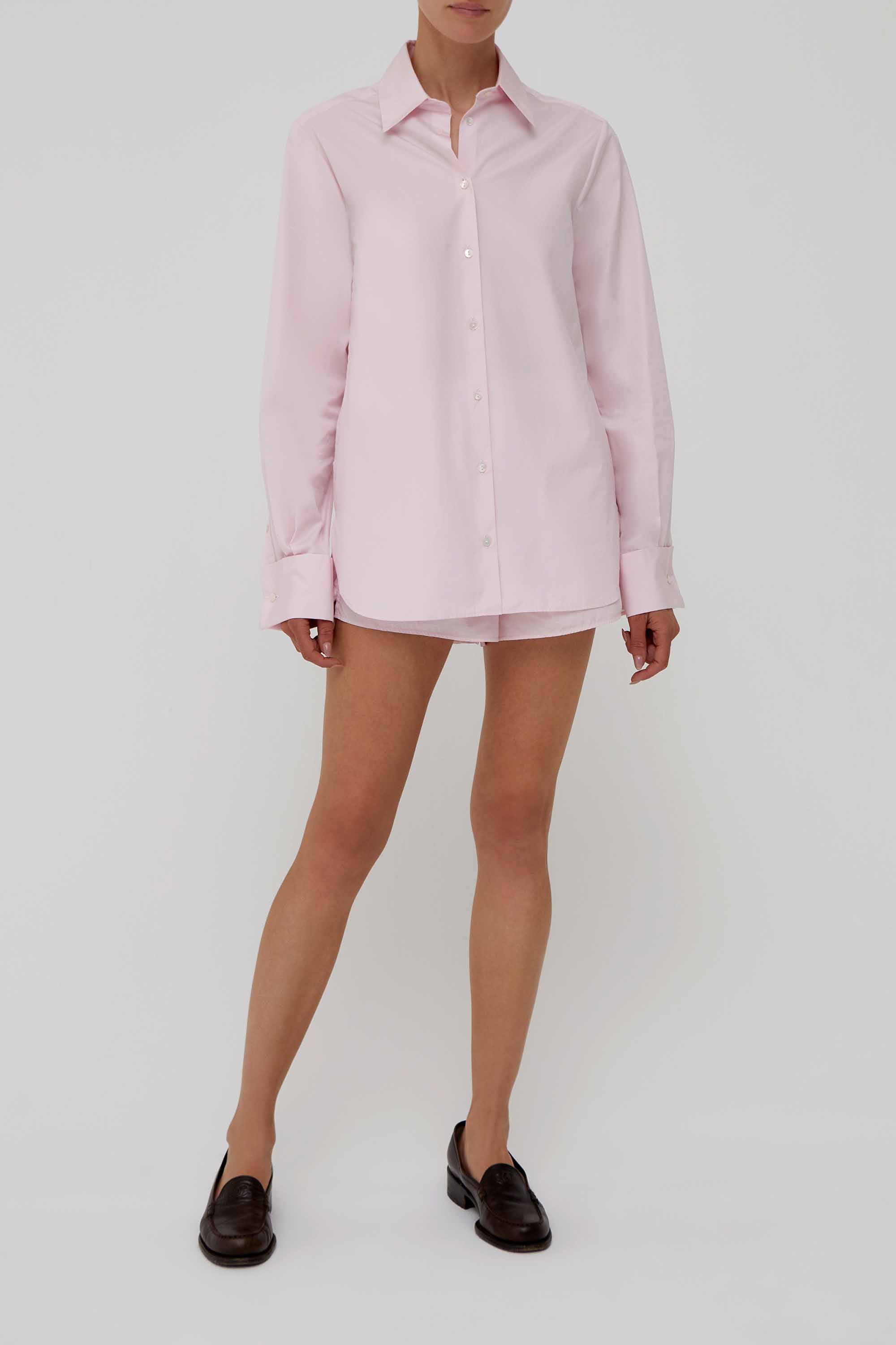 Crisp pink button-down shirt in fine cotton poplin, tailored with a sharp collar, elongated cuffs, and a fluid drape for structure and ease.