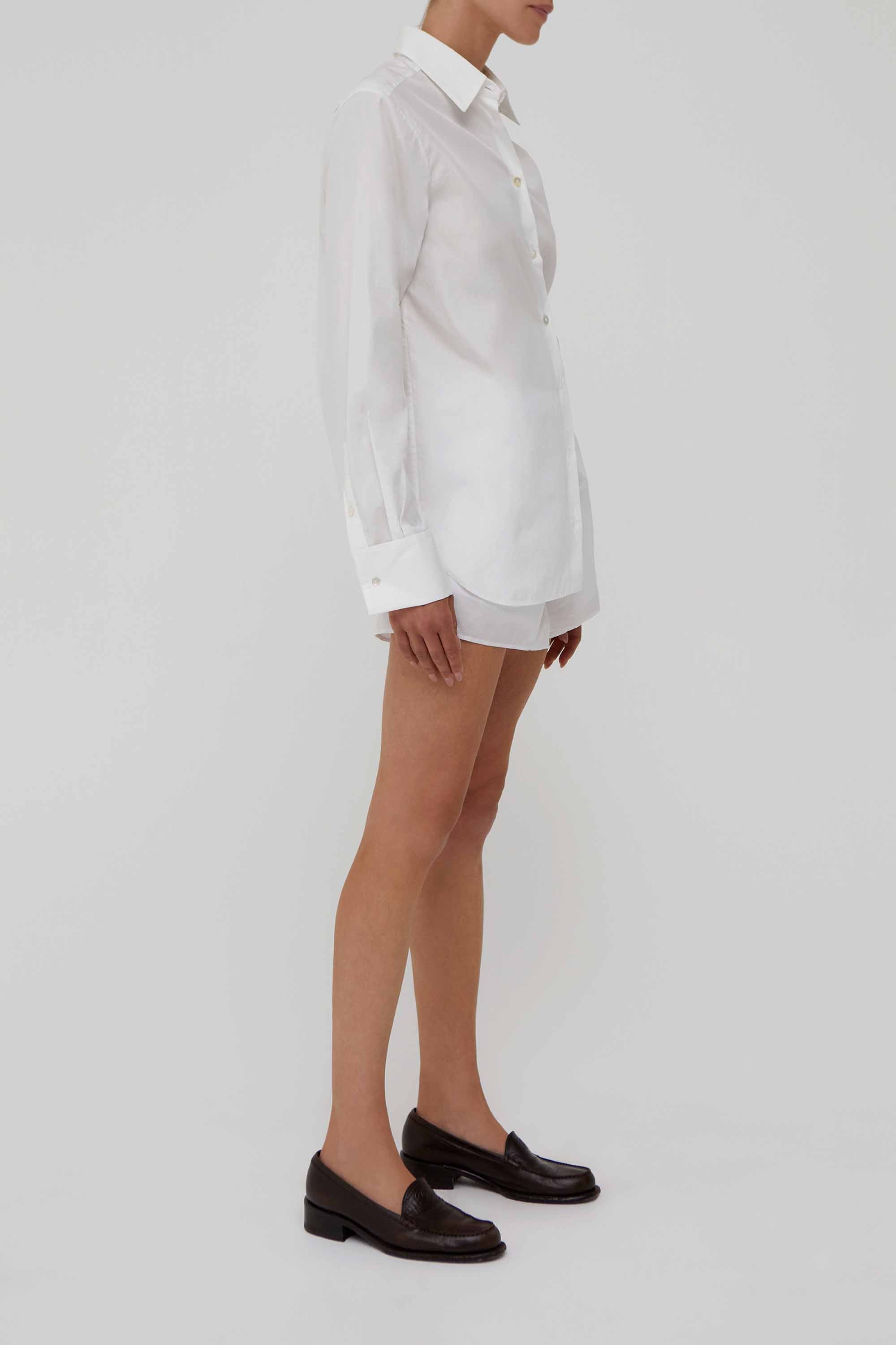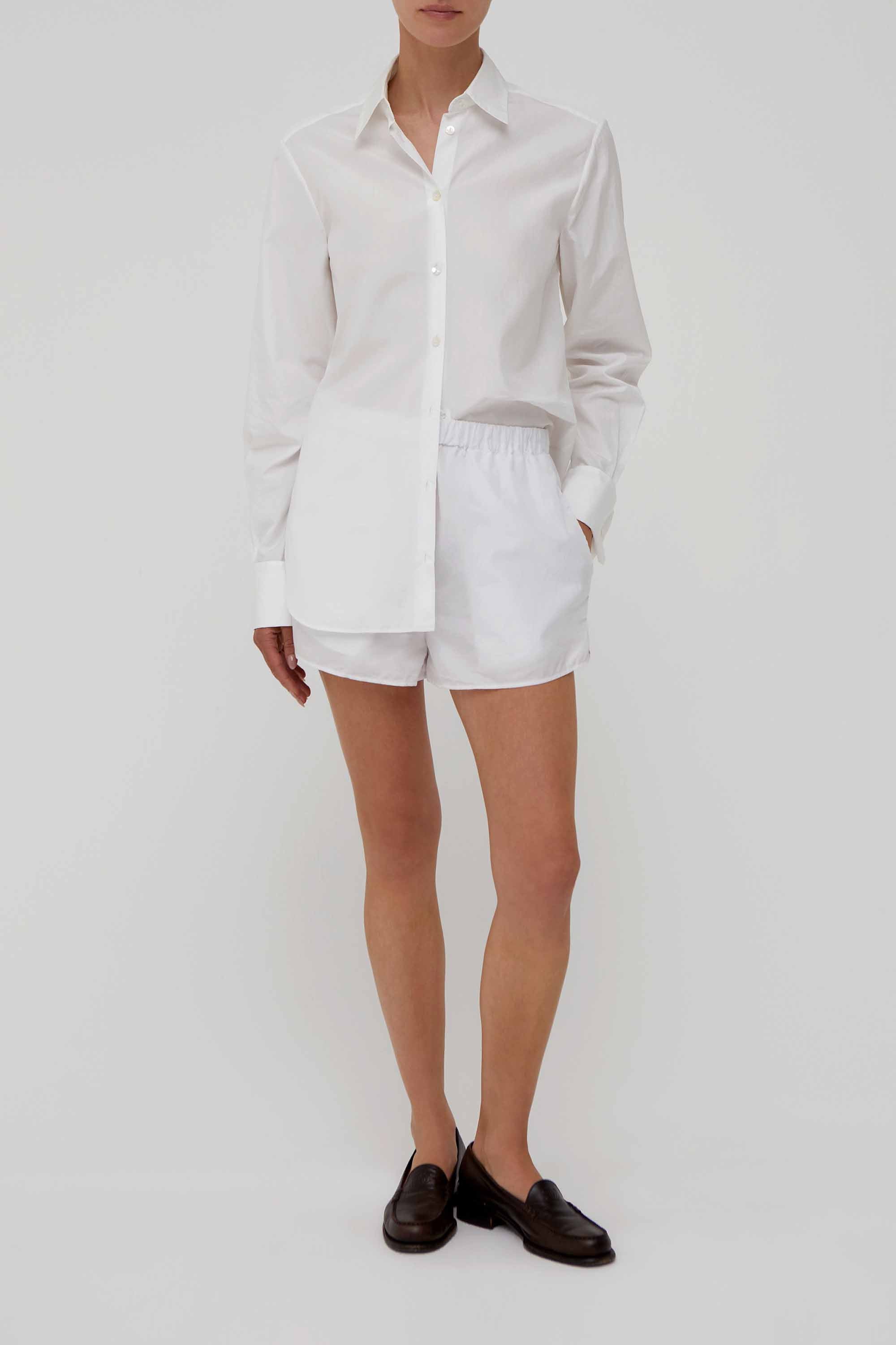 Crisp white button-down shirt in fine cotton poplin, tailored with a sharp collar, elongated cuffs, and a fluid drape for structure and ease.