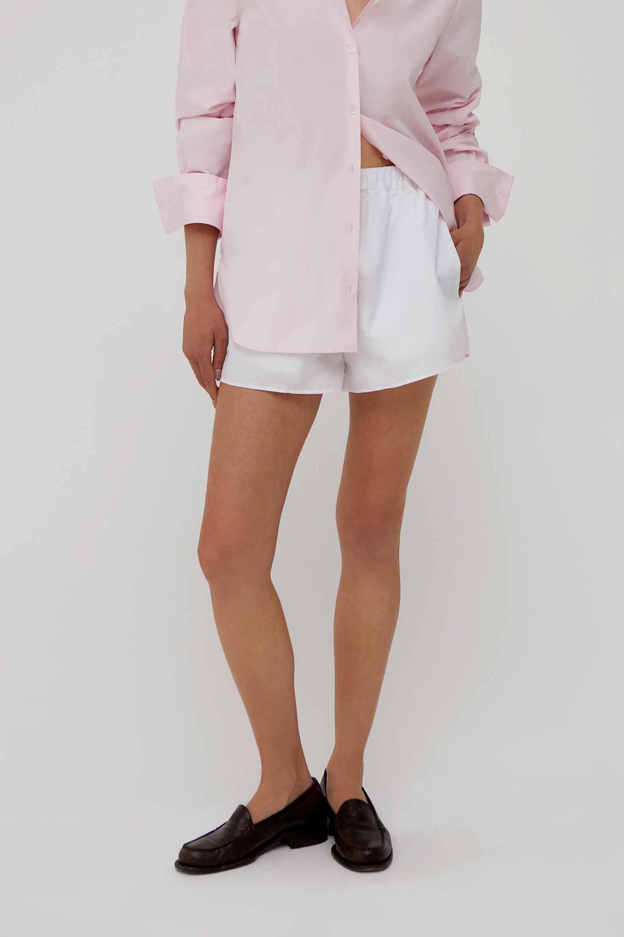 Relaxed white shorts in crisp cotton poplin, cut with a mid-rise elasticated waistband and side pockets, finished with a clean hem for a versatile silhouette.