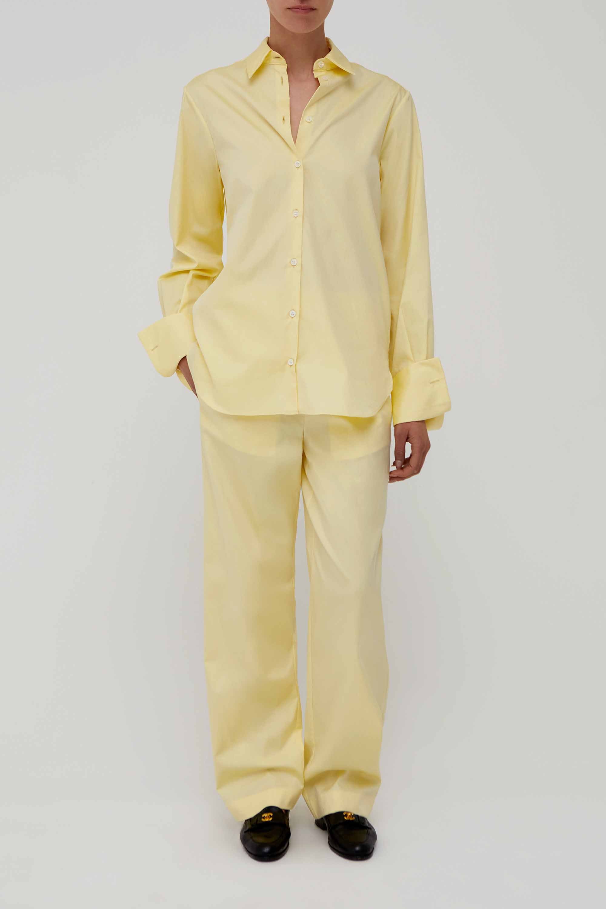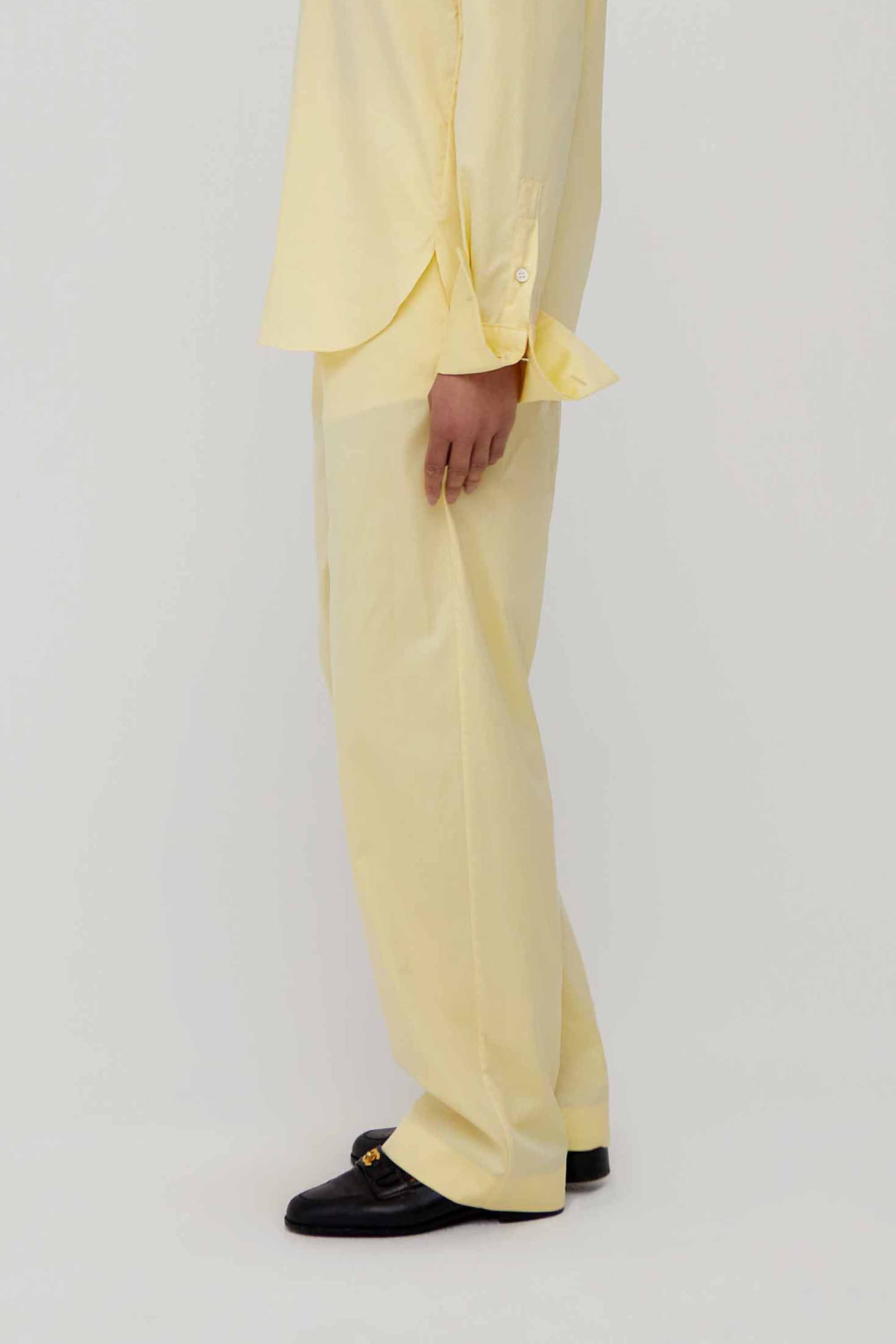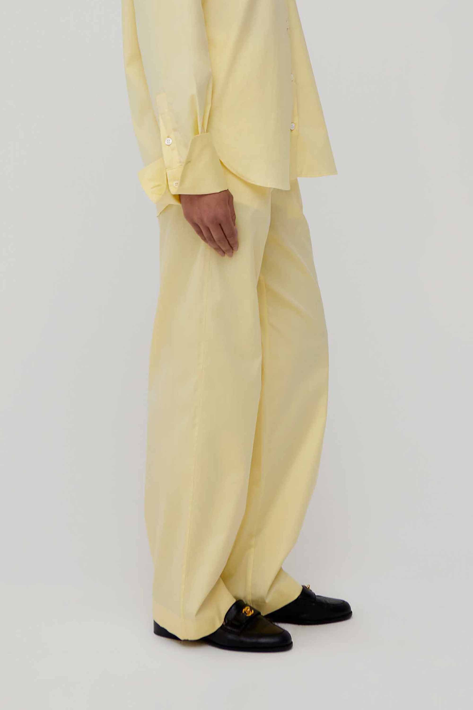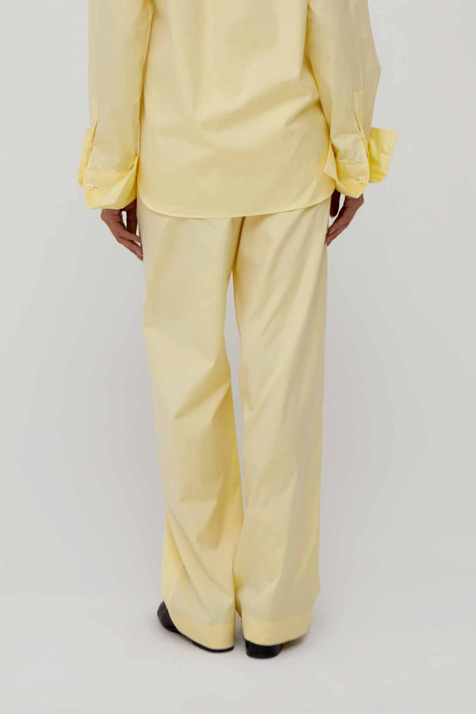 Wide-leg trousers in yellow cotton, tailored with a mid-rise waist and a fluid, elongated silhouette, finished with a clean waistband for a crisp, menswear-inspired look.