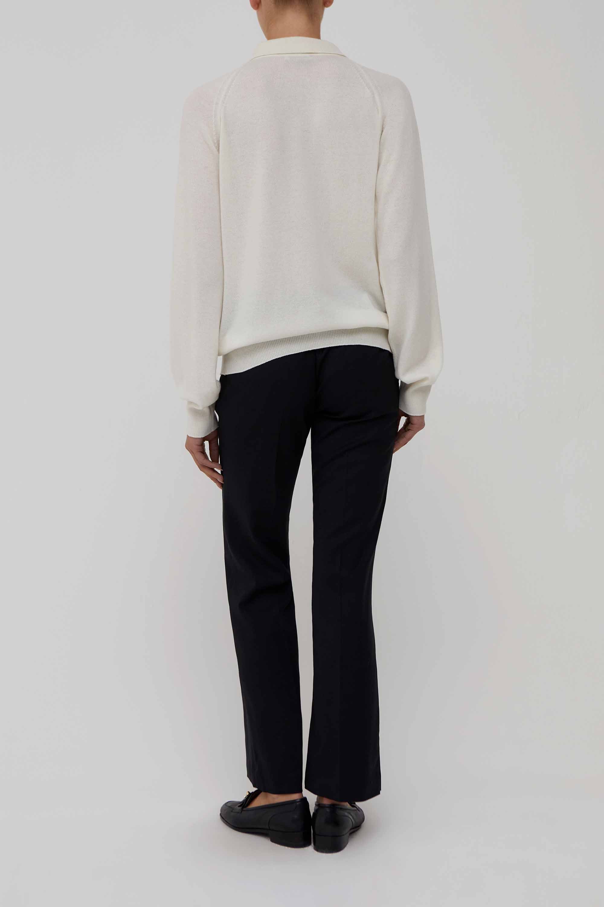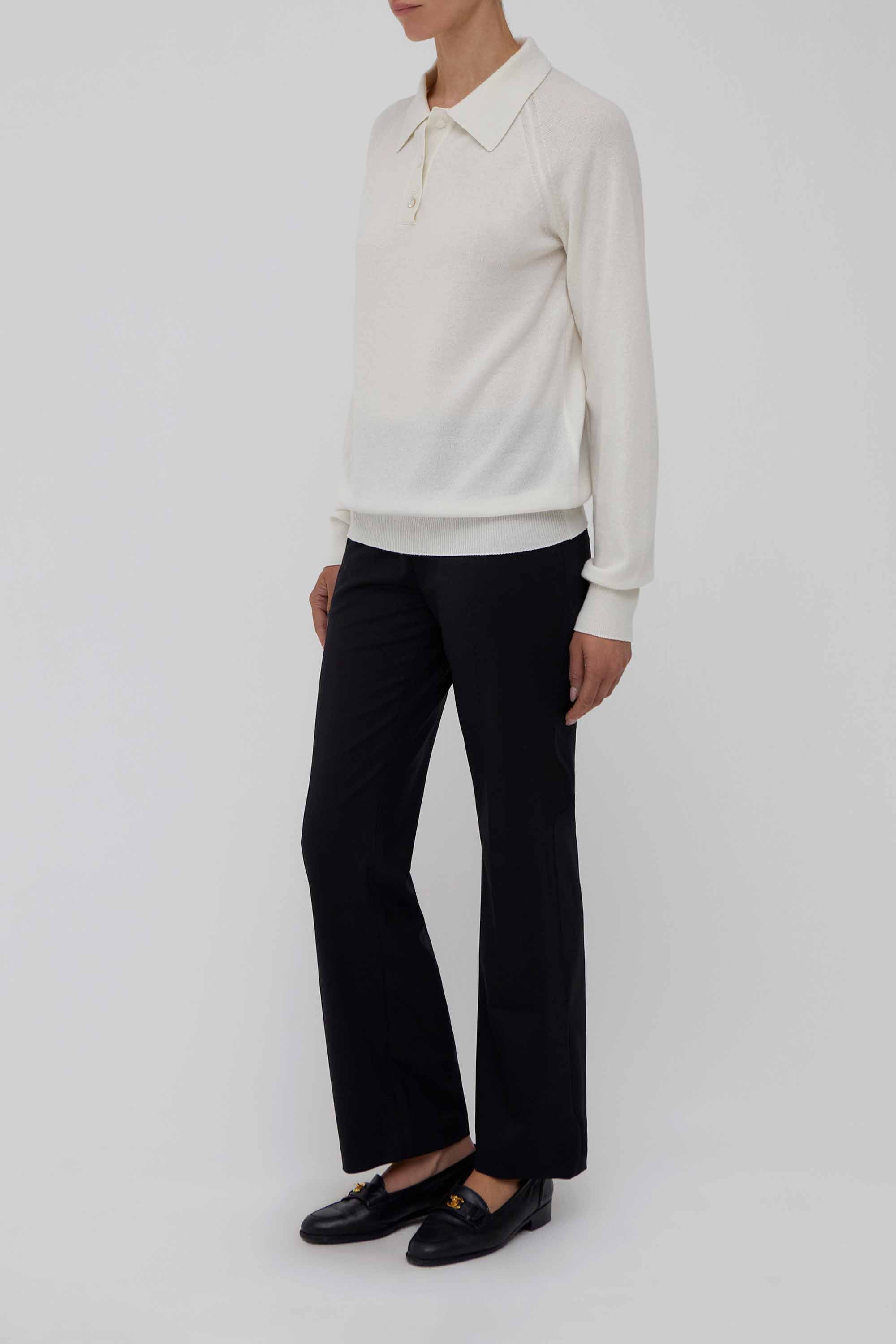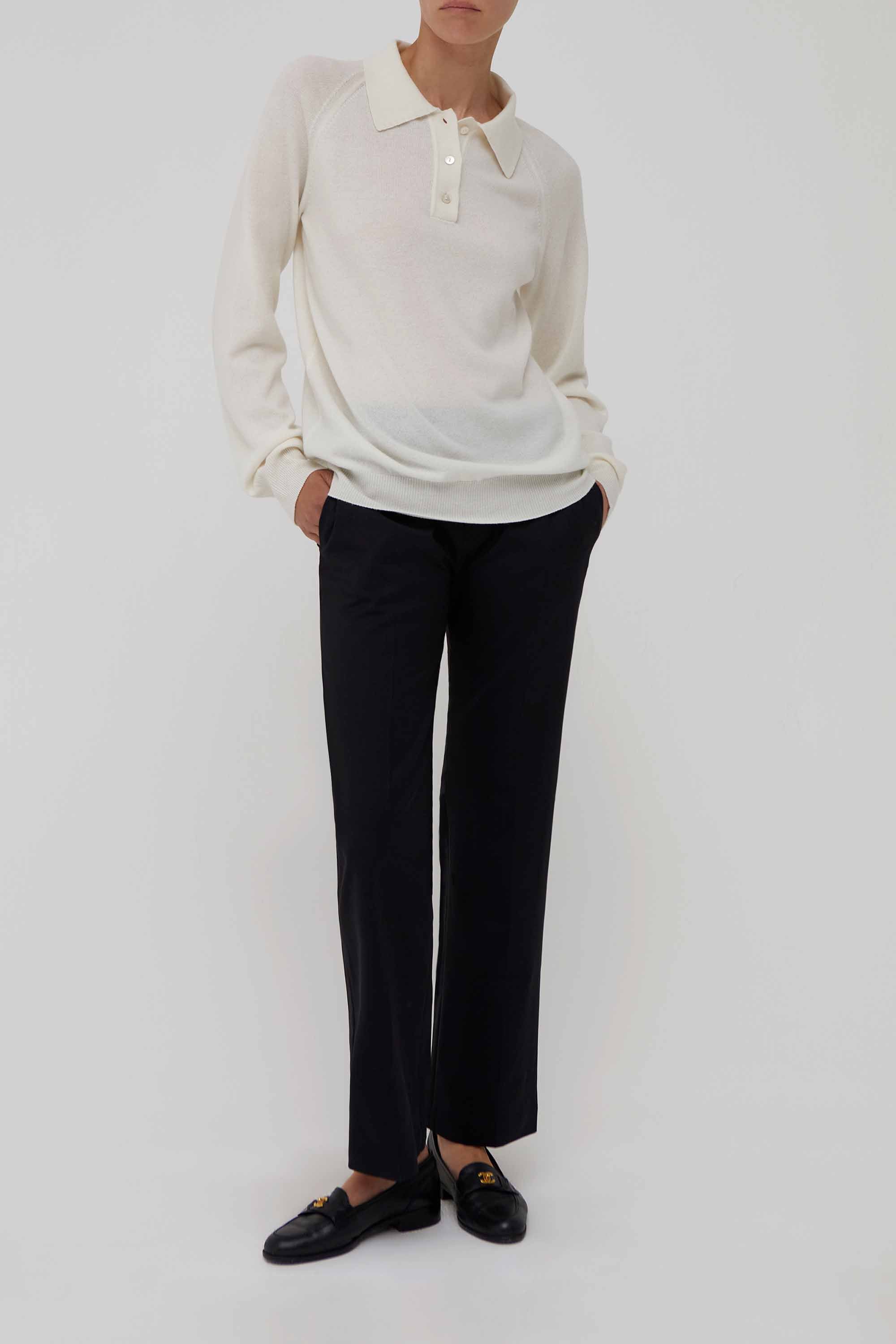 Long-sleeve polo in off white cashmere, tailored with a softly structured collar, three-button placket, and a fluid drape, delivering an elegant fusion of ease and warmth for journeys near and far.