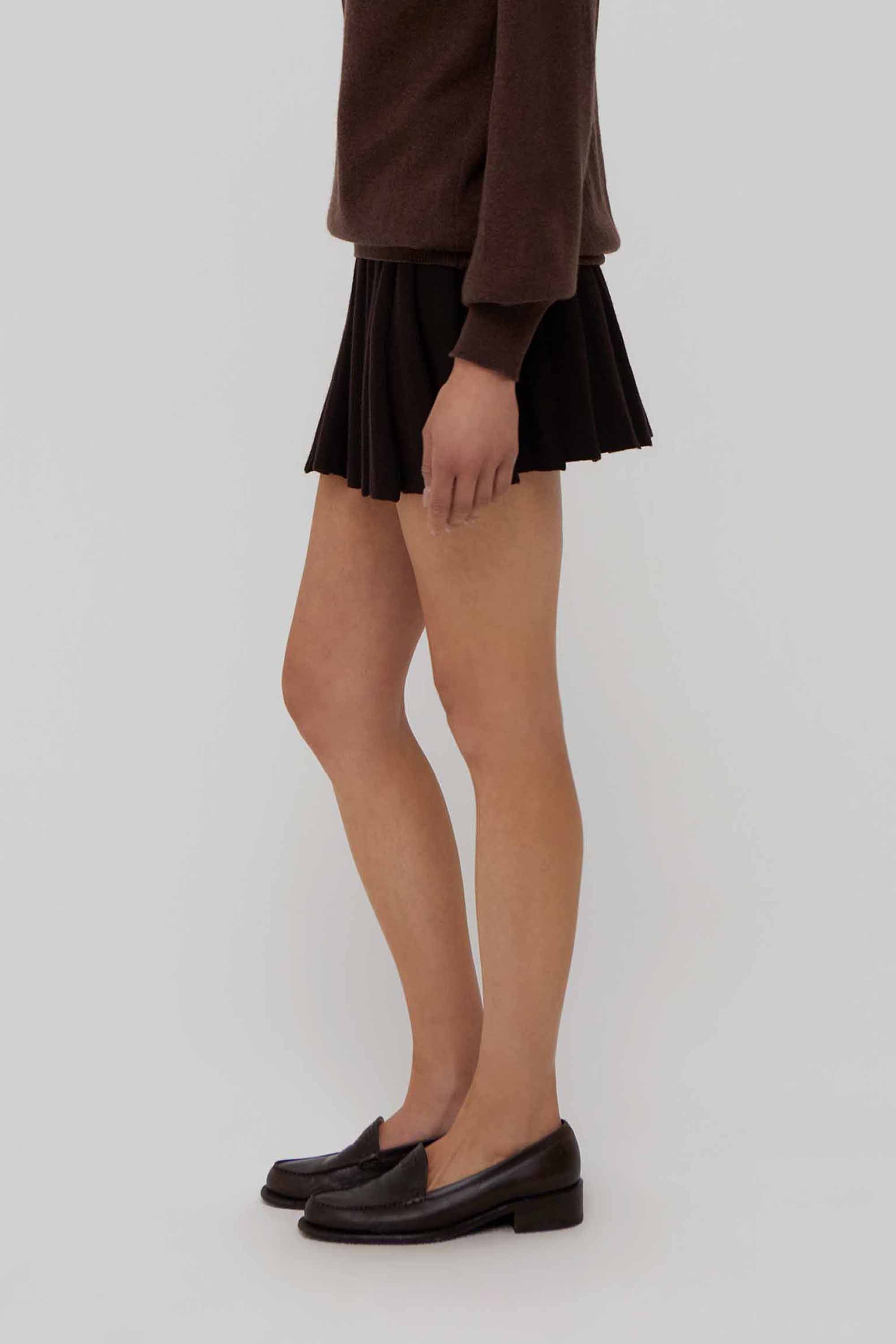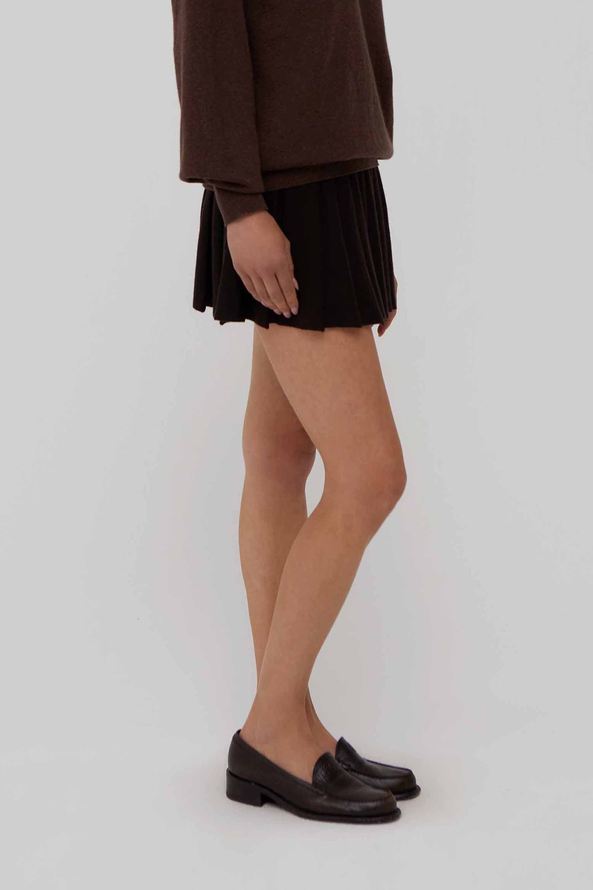 Pleated mini skirt in soft brown wool, cut with crisp, uniform folds for structured movement, and finished with a clean waistband for a refined, versatile silhouette.