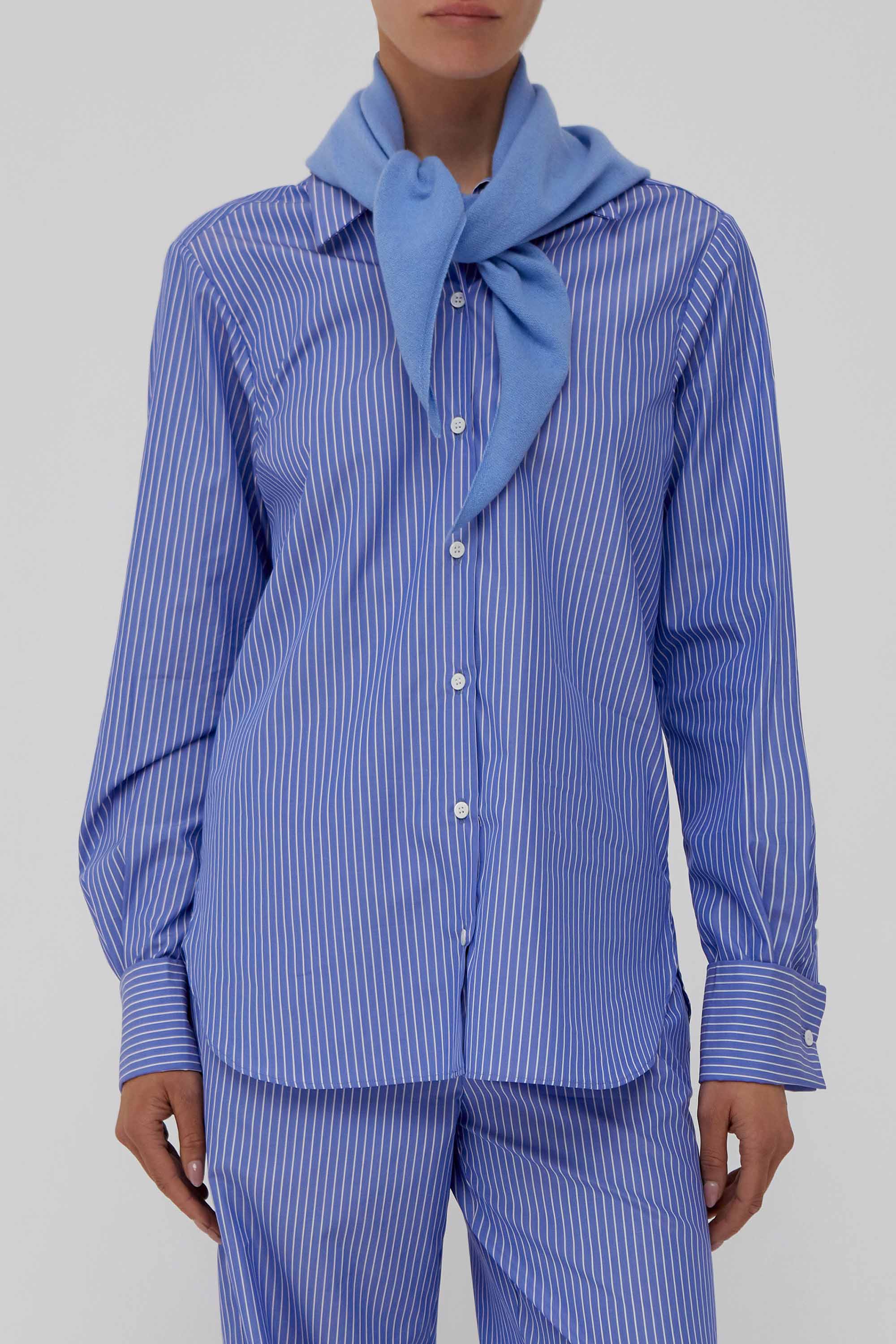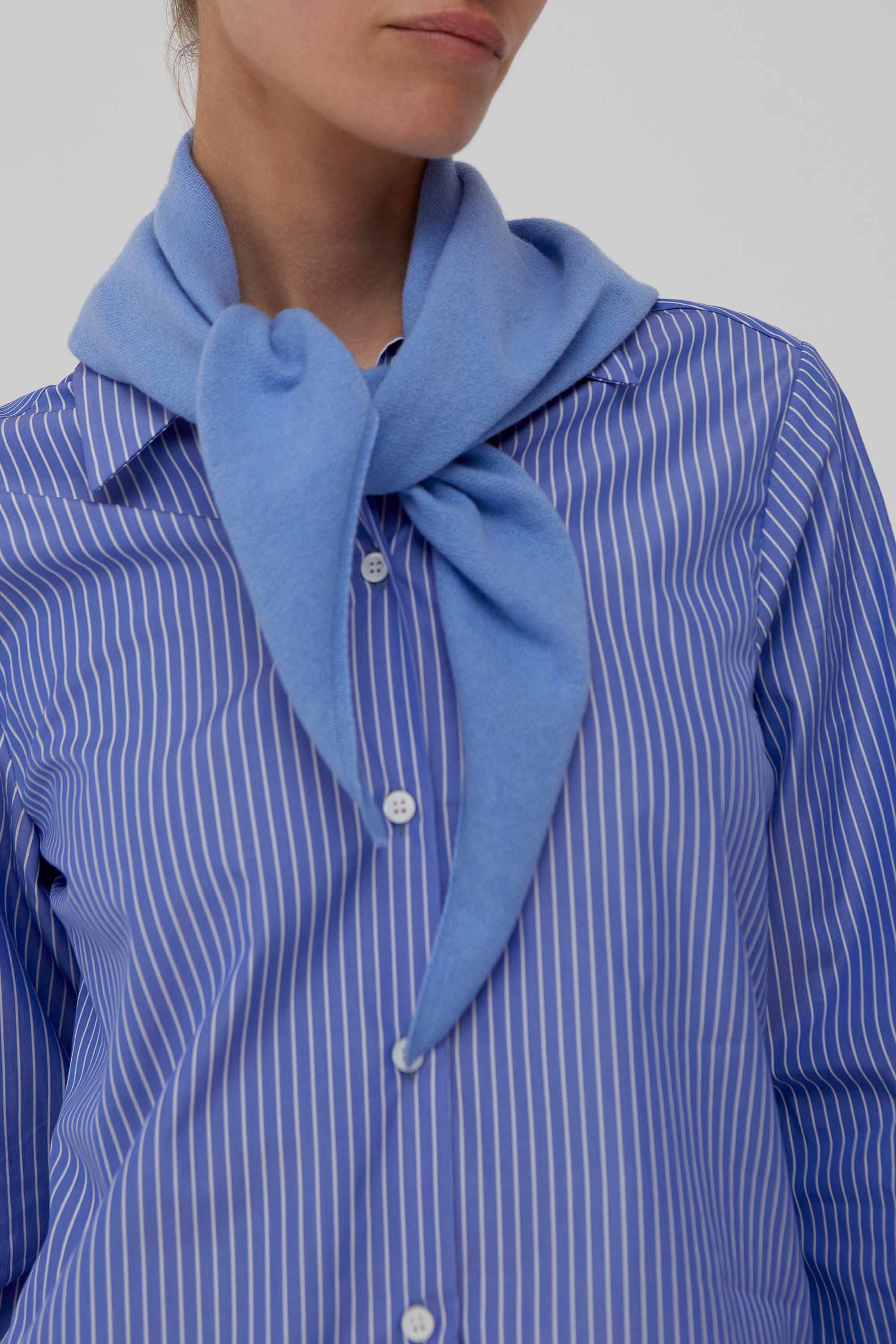 Triangle scarf in soft light blue cashmere, crafted in a fazzoletto shape, offering a lightweight drape and sumptuous hand-feel, perfect for knotting at the neck or layering for a touch of refined warmth.