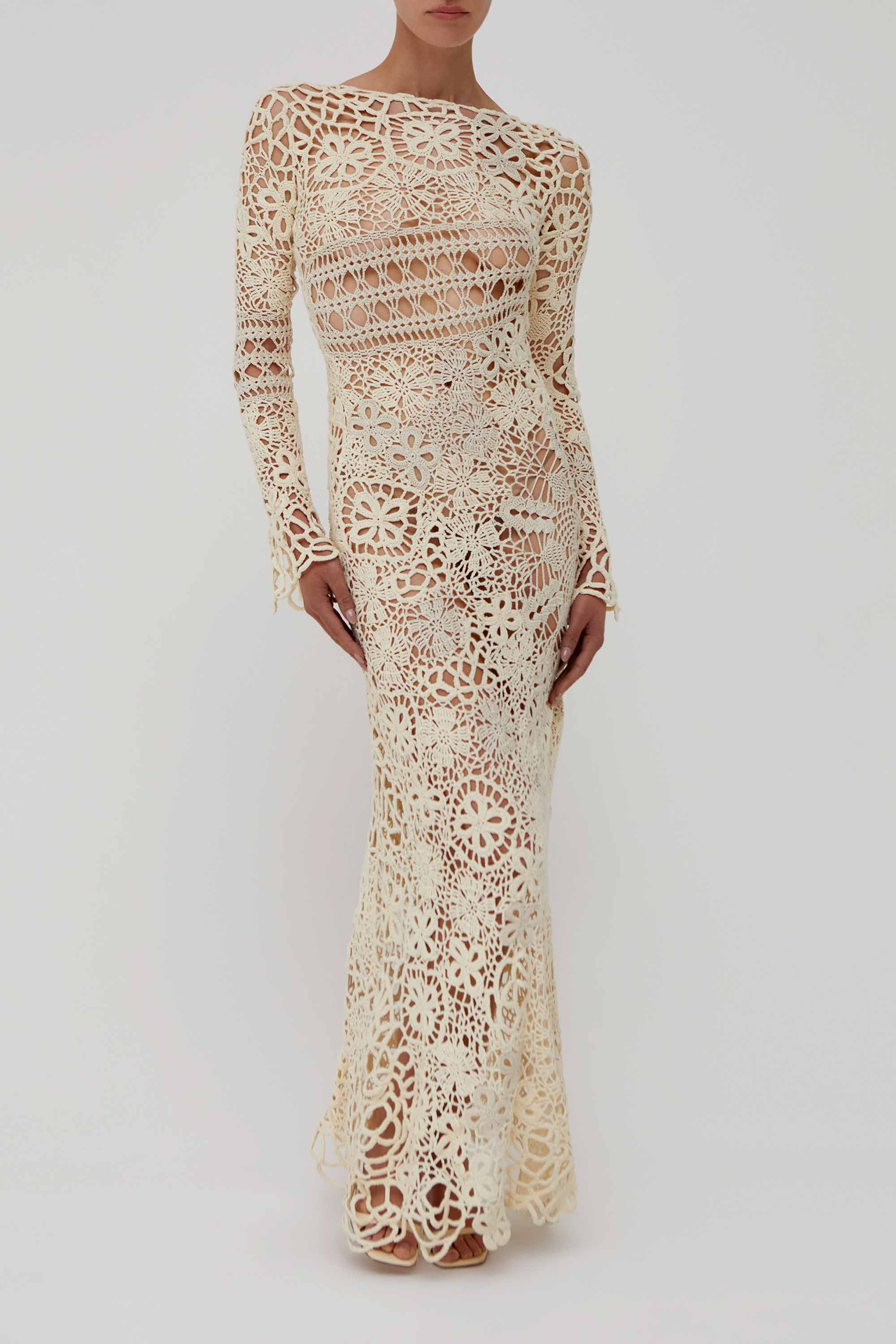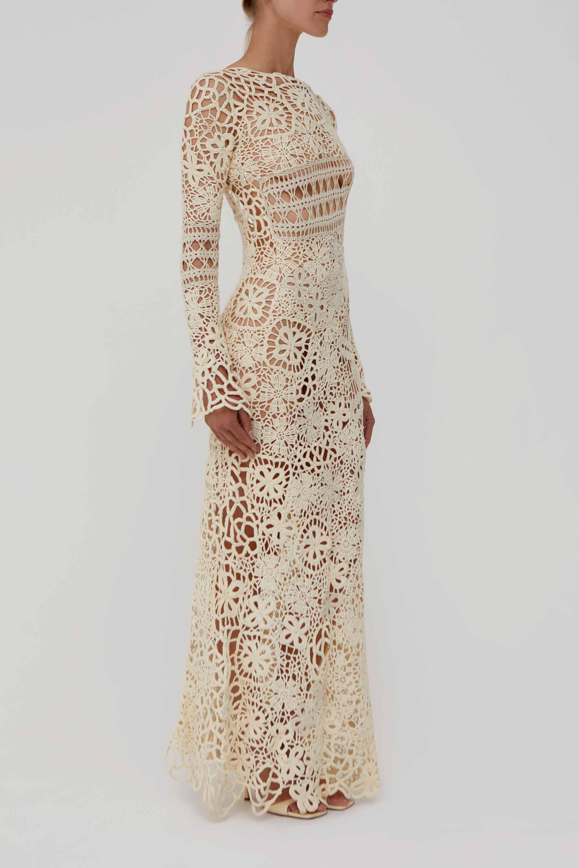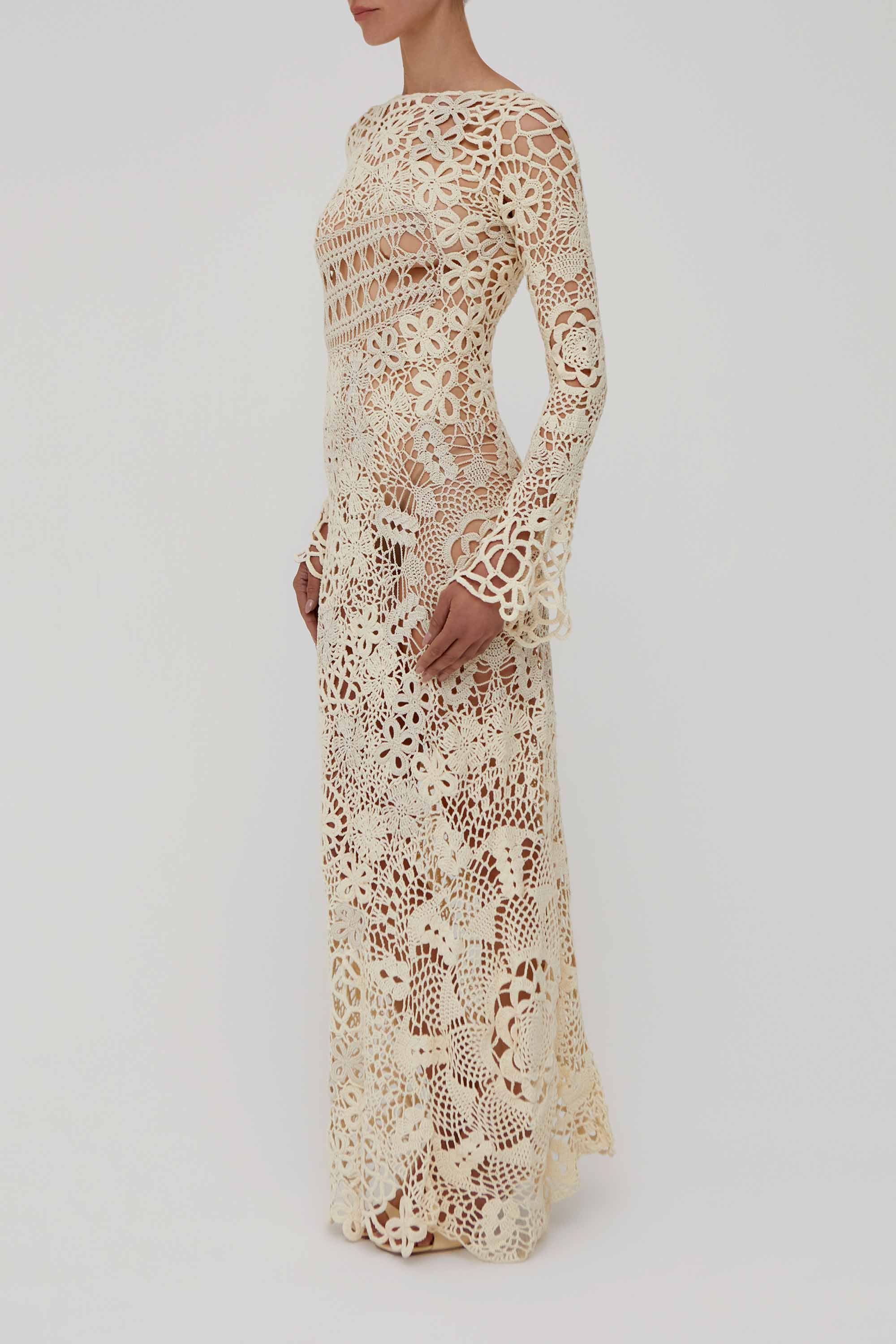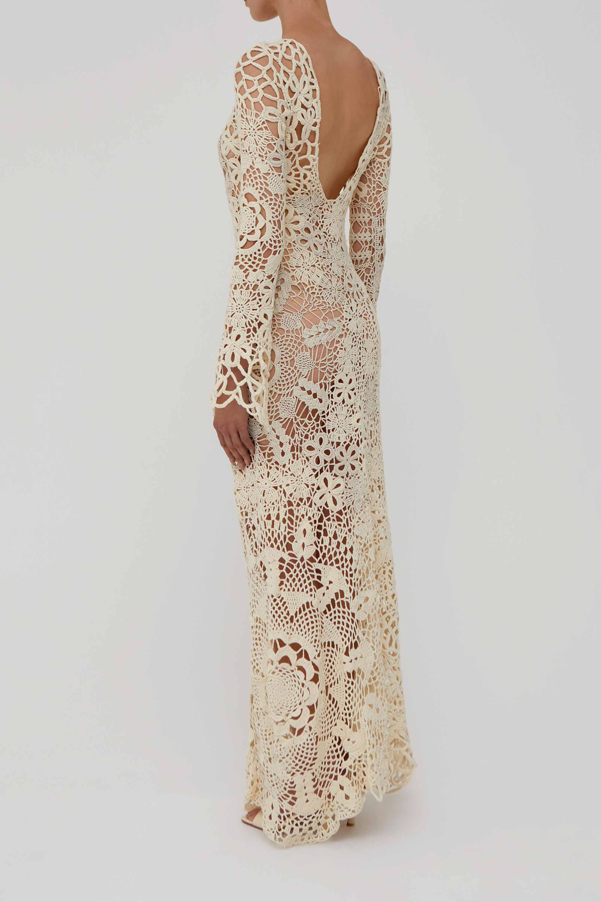 An example of exceptional Italian craftsmanship, the Magnolia dress is hand-crocheted by artisans in northern Italy. This full length style takes approximately 125 hours of dedicated work and is assembled from two carefully selected cotton blend yarns to achieve tonal variations and couture feel. It is slightly fitted through the body with a relaxed sleeve silhouette and an open back.