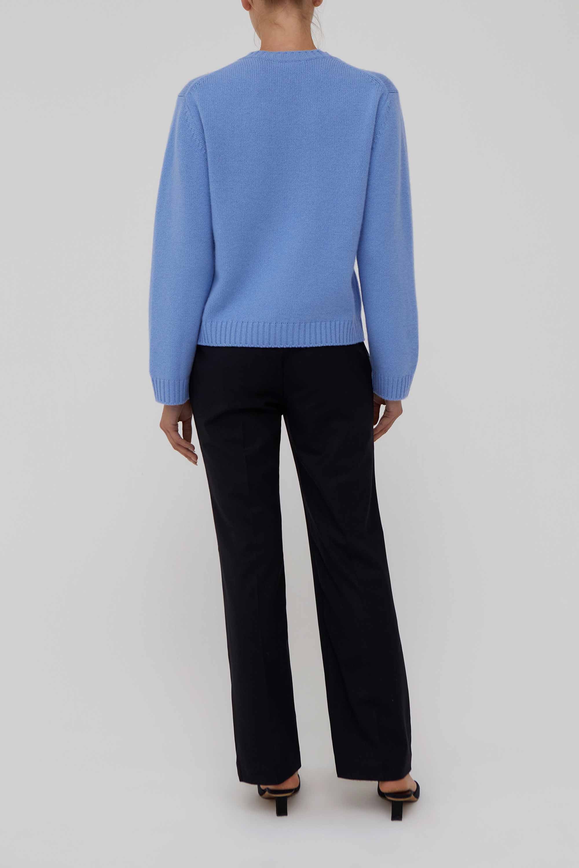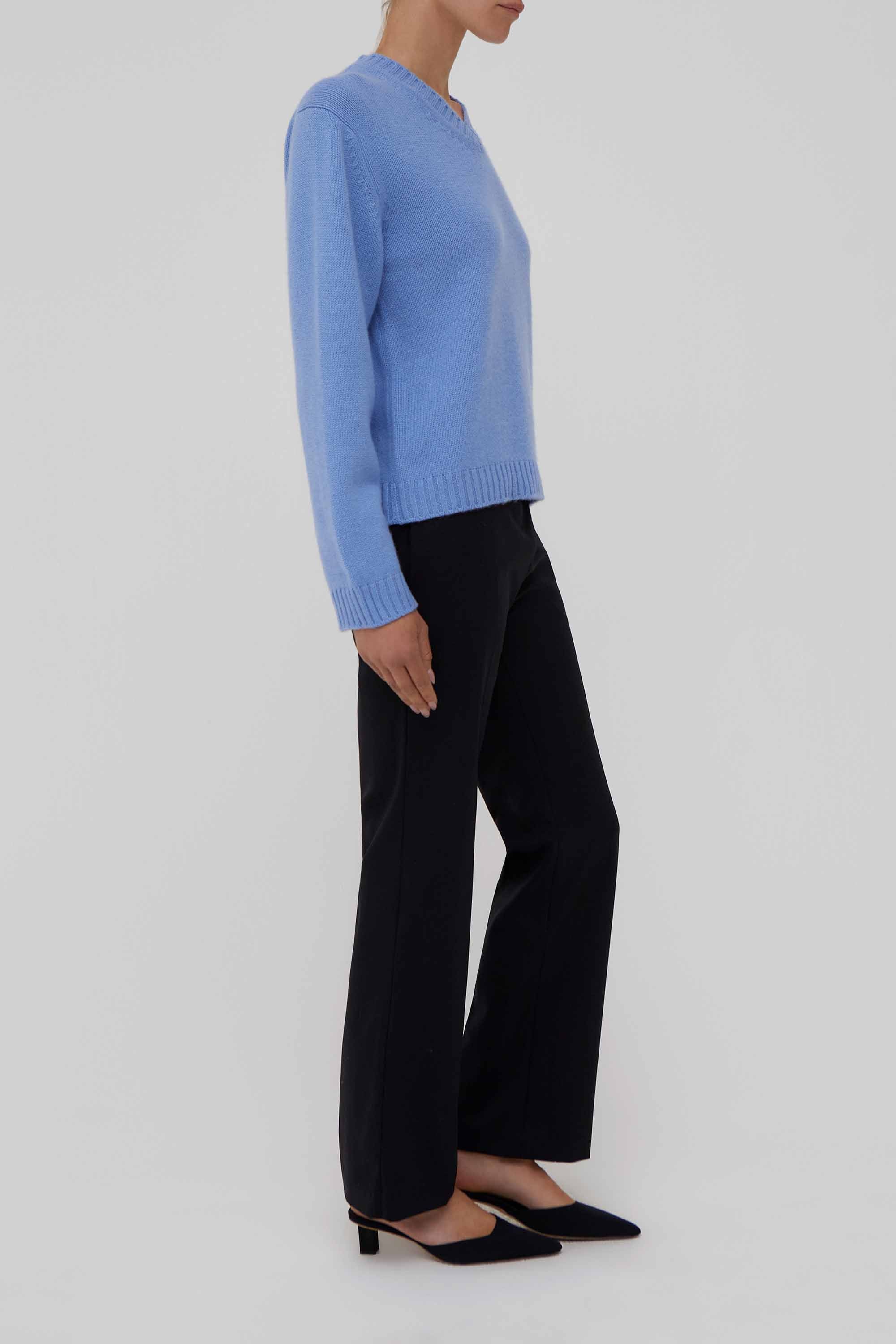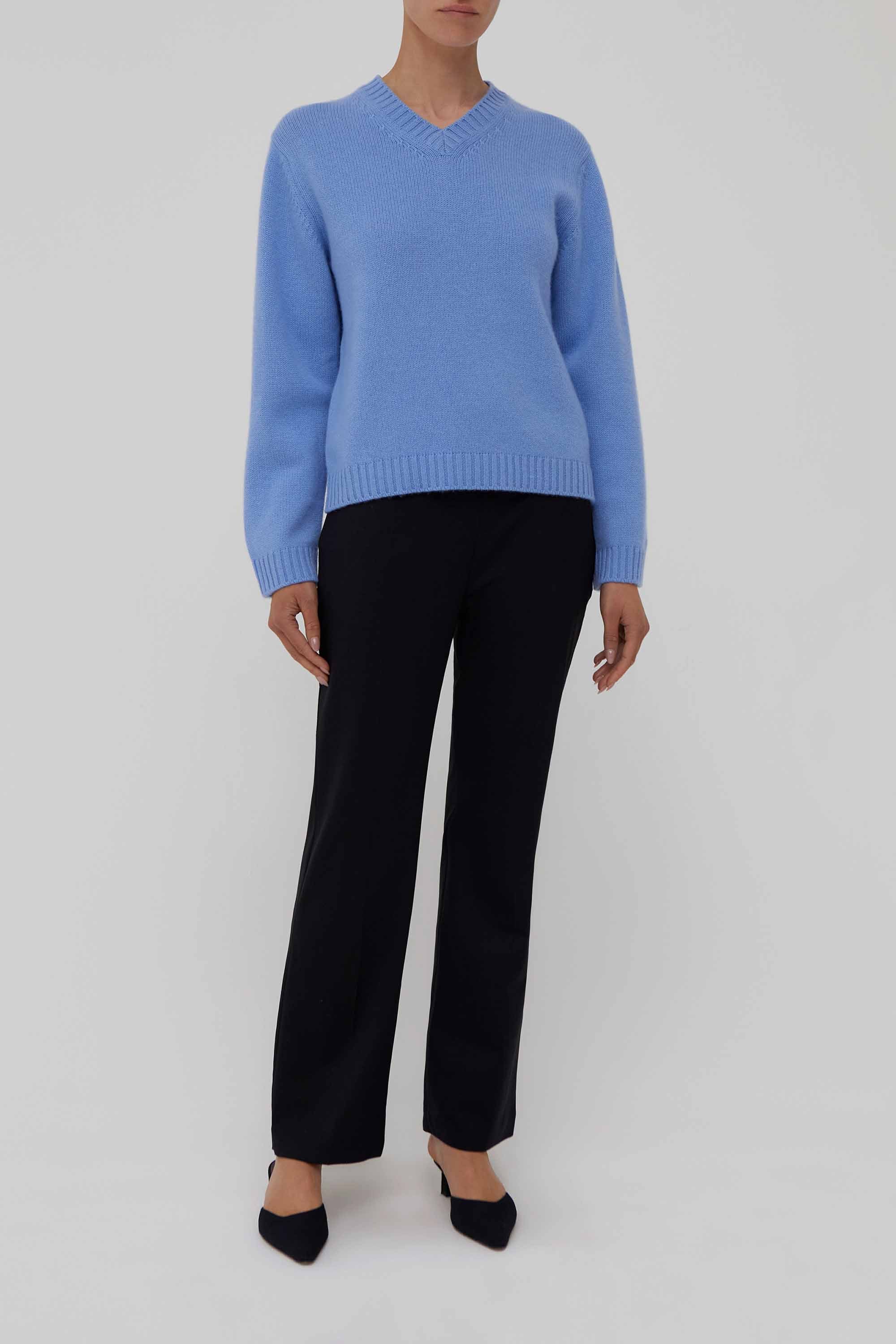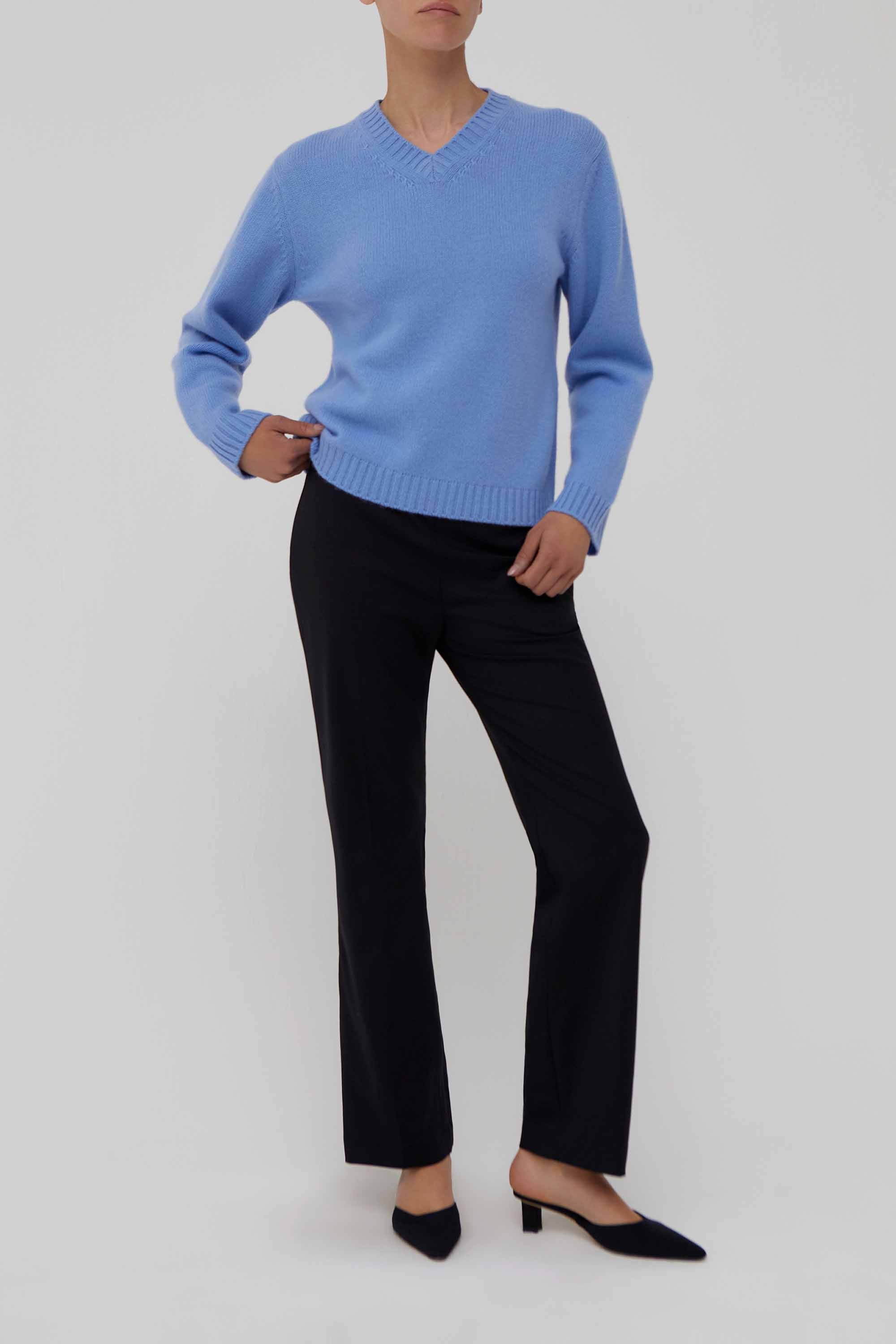 Classic V-neck sweater in light blue cashmere, crafted for a soft, airy hand with a relaxed silhouette, finished with finely ribbed trims at the neckline, cuffs, and hem for understated refinement.