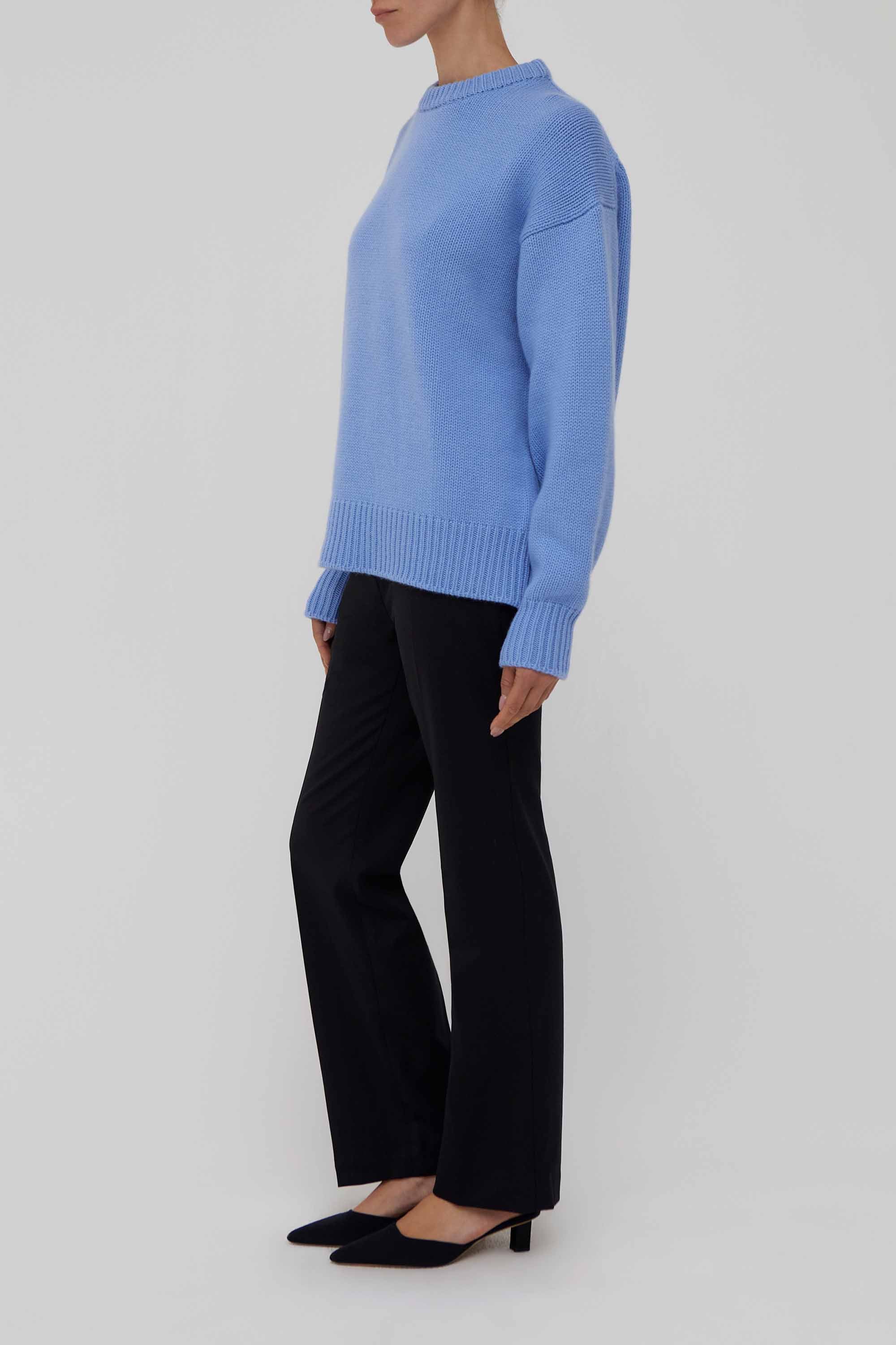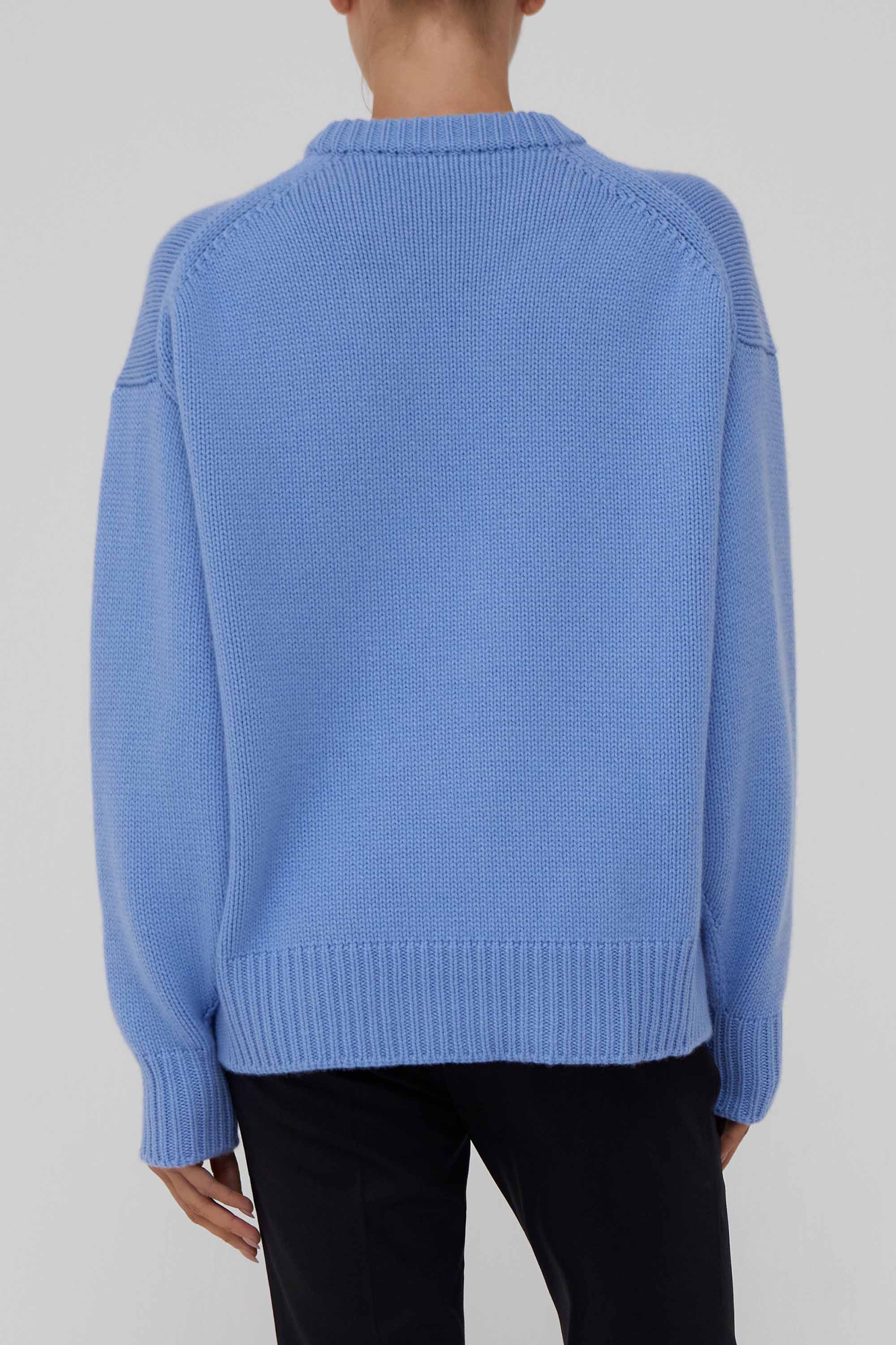 Oversized crewneck sweater in light blue cashmere, knit with a sumptuous, lofty hand, featuring dropped shoulders and wide rib trims at the collar, cuffs, and hem for a relaxed elevated silhouette.