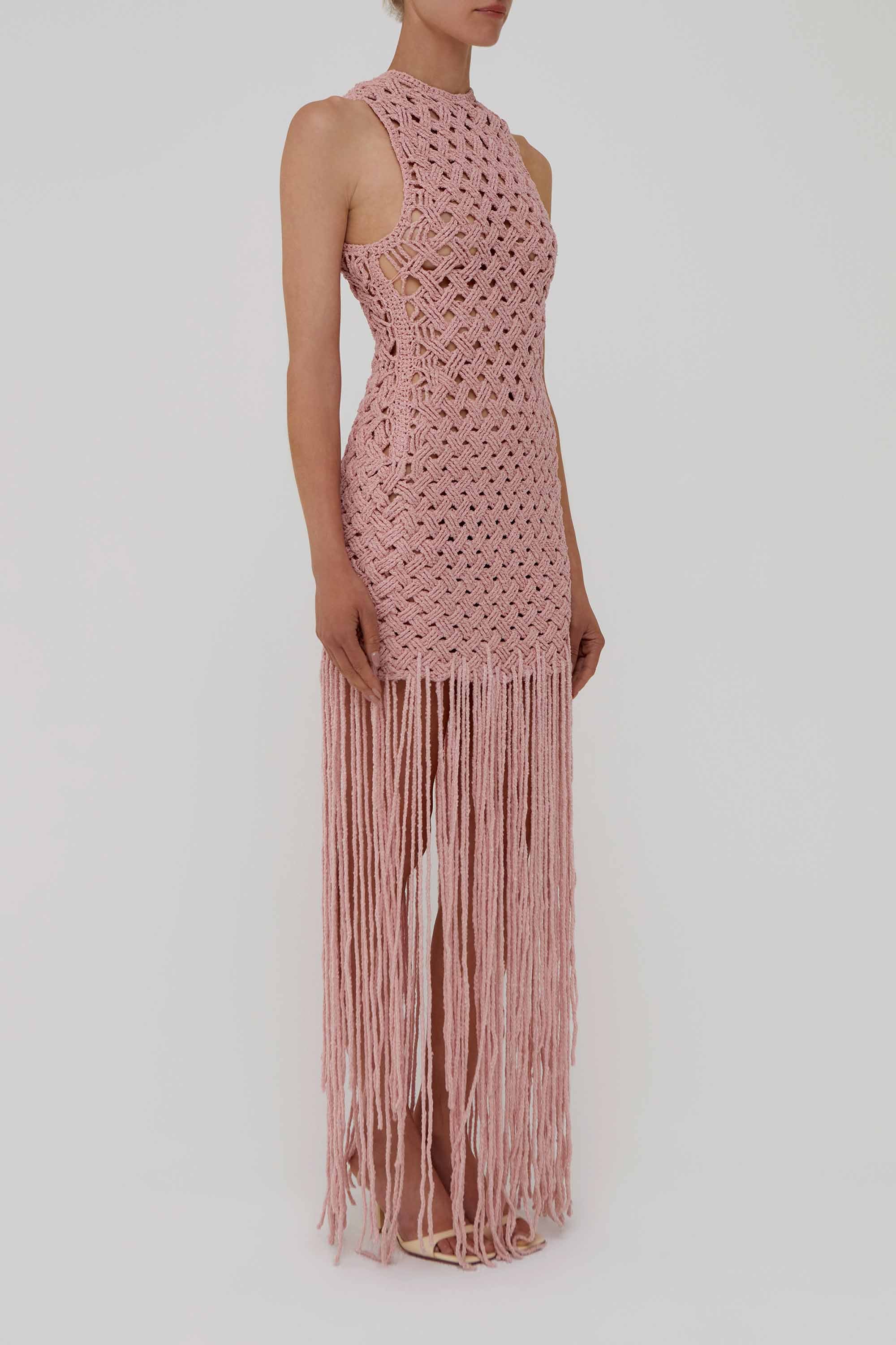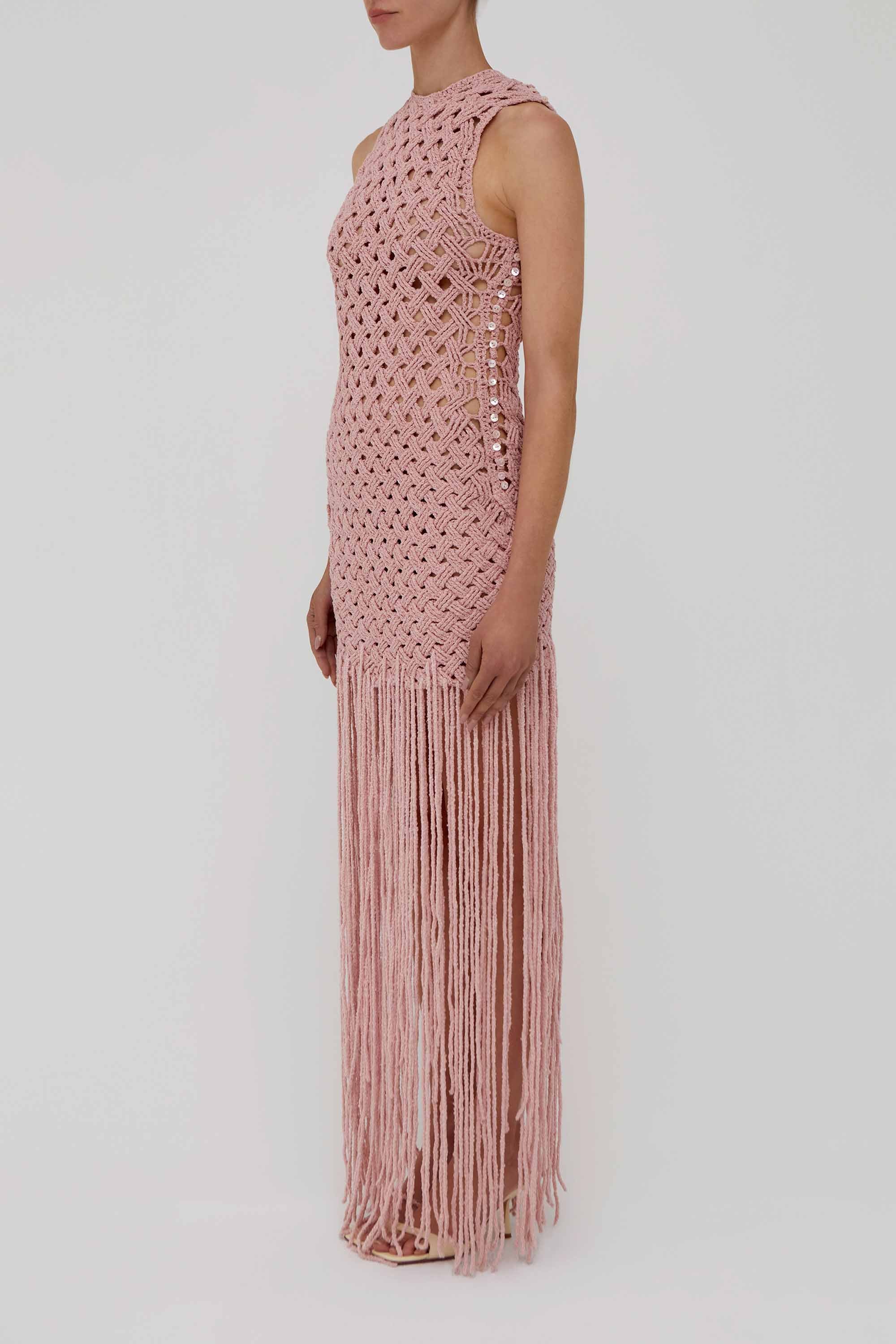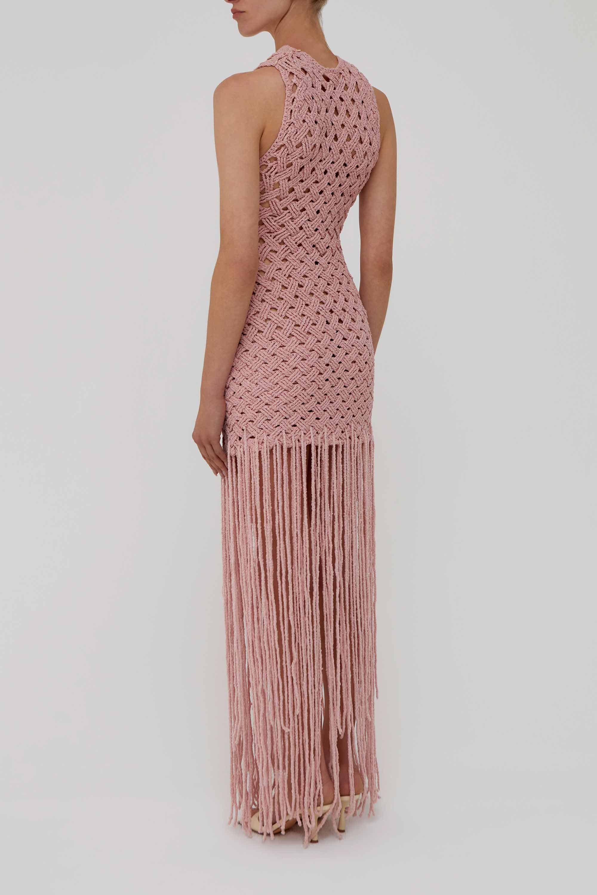 A hand-knotted masterpiece of contemporary couture, this sleeveless gown is meticulously crafted from premium Japanese yarn. The intricate latticework envelops the body in an open, sculptural weave, revealing subtle glimpses of skin before cascading into a dramatic floor-length fringe that sways with every movement. Each piece is entirely handmade, embodying hours of artisanal precision and a dedication to craftsmanship that renders every gown a singular work of wearable art.