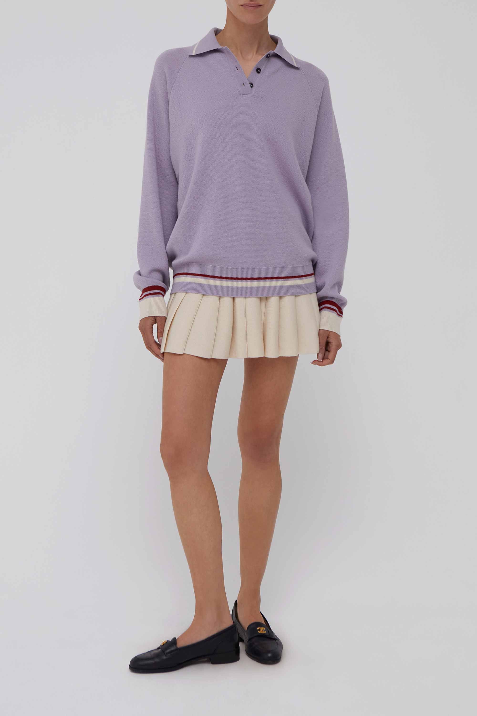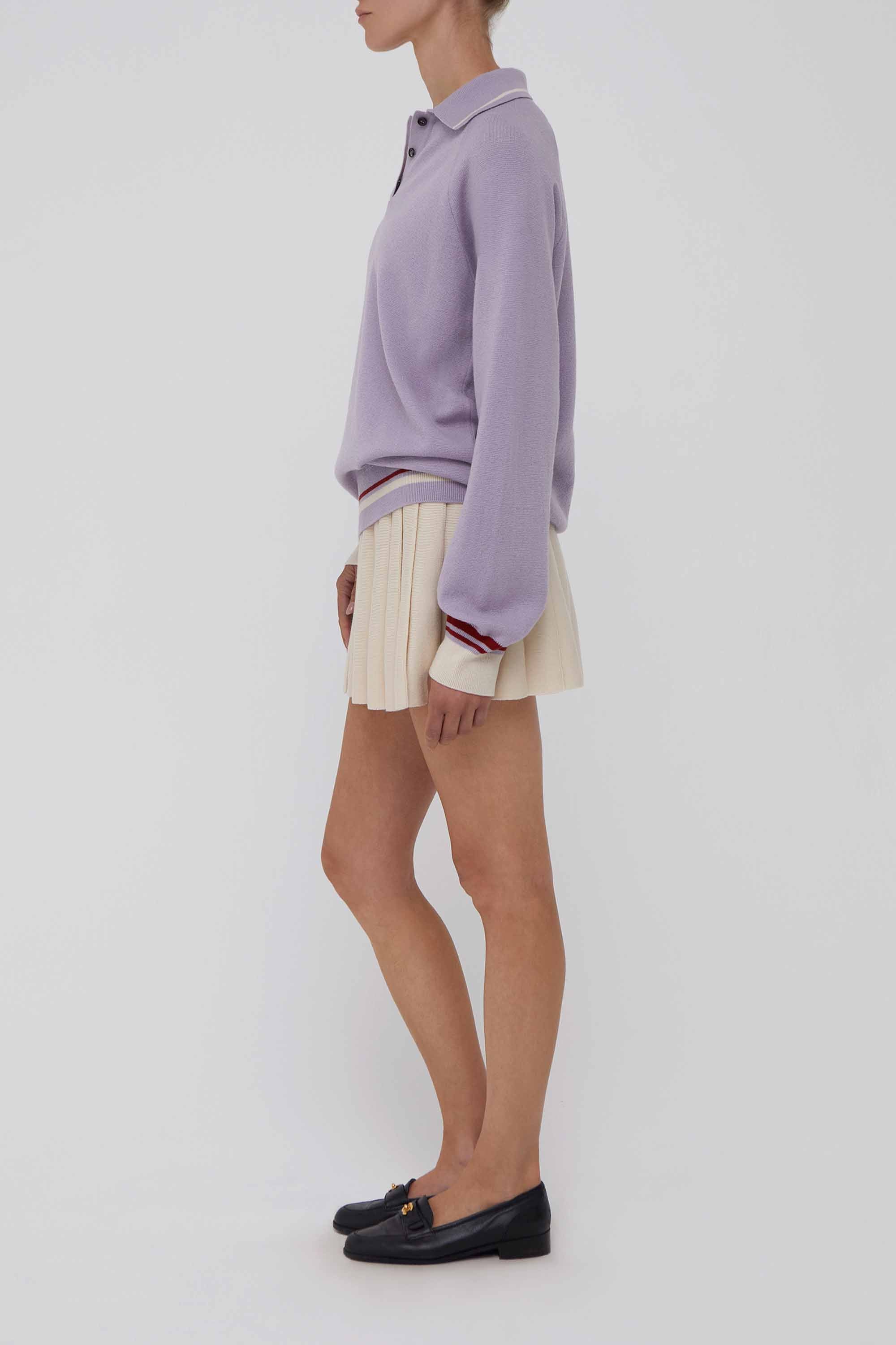 Relaxed long-sleeve polo in soft lilac knit, accented with a contrast ivory collar and cuffs, and finished with fine burgundy tipping at the hem and sleeves: an effortless balance of athletic refinement.